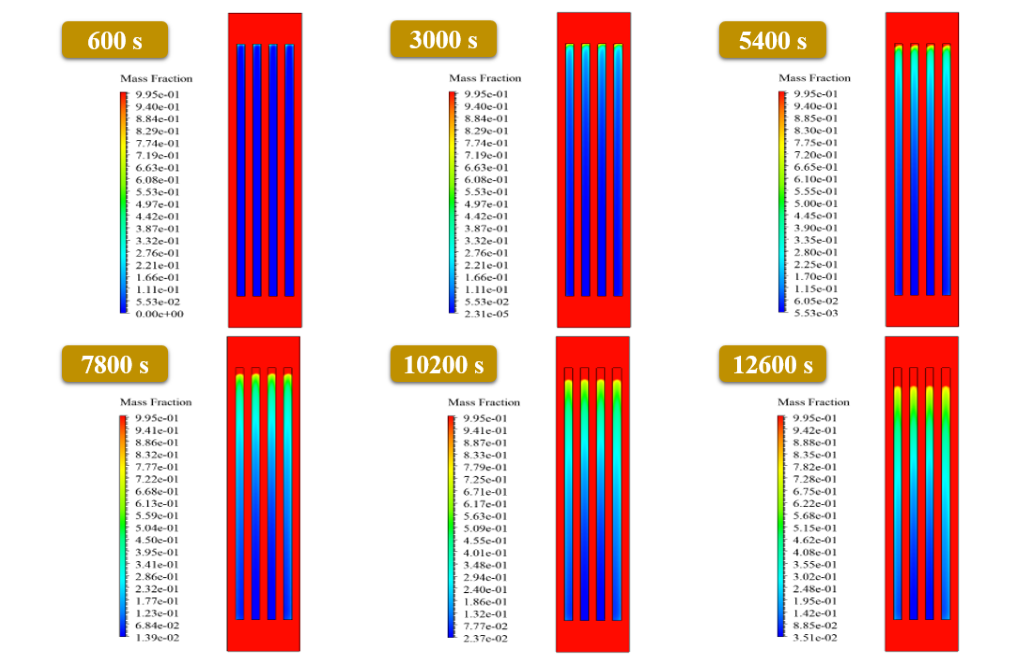 At the end of the solution process, two-dimensional contours related to the liquid’s pressure, velocity, temperature, and mass fraction are obtained.