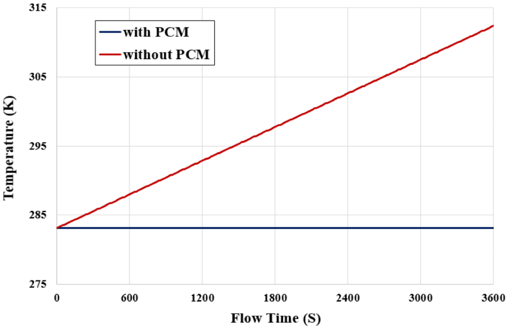 After the simulation, we obtained the plot of the average temperature inside the room over time. This plot compares two modes (with PCM and without PCM).