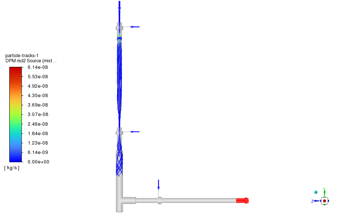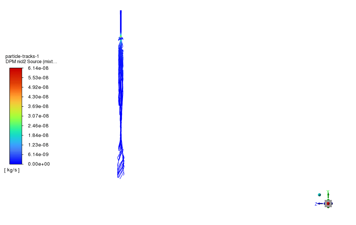 - Powder precursors (FeCl₂ and NiCl₂) are injected into the domain using the Discrete Phase Model (DPM).