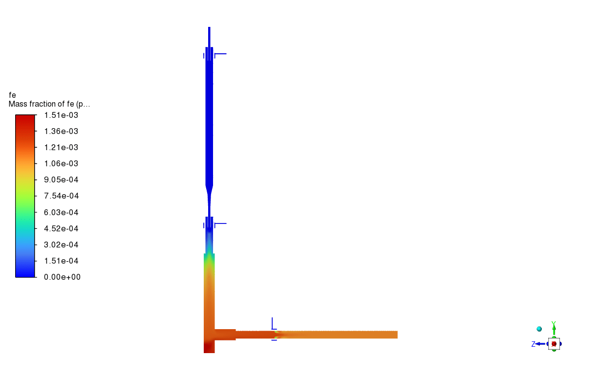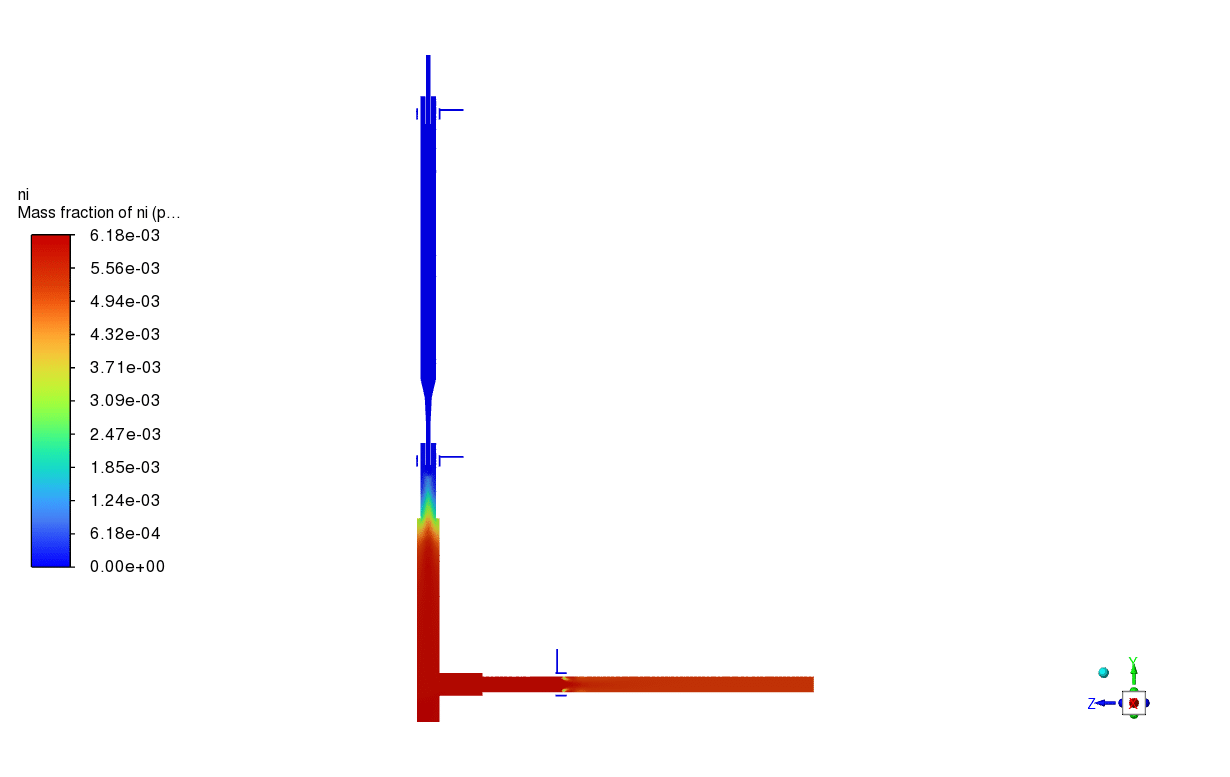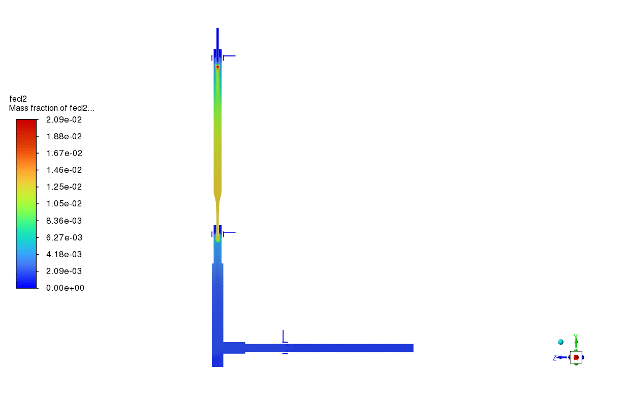The simulation results of PBM project, provided a comprehensive view of the thermal, chemical, and particle behavior inside the flow domain. The fluid temperature contours showed the influence of the two high-temperature plasma zones (2500 K and 3000 K), which created strong thermal gradients and promoted particle reaction and transformation. The pathlines of the injected powder particles demonstrated how FeCl₂ and NiCl₂ dispersed within the reactor before undergoing evaporation and reduction. Species distribution contours confirmed that both chlorides were effectively consumed through reactions with hydrogen gas, with noticeable decreases in their concentrations across the domain. This correlated well with the zones of high reaction rate observed for the first two reactions, indicating active conversion of FeCl₂ and NiCl₂ into elemental Fe and Ni.