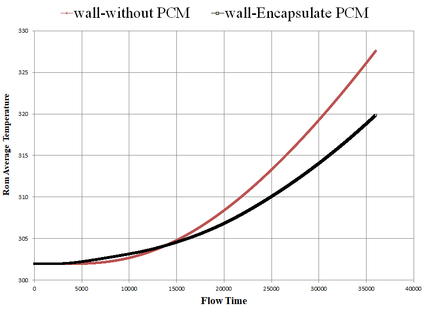 The incorporation of PCM (Phase Change Material) capsules into the walls of a room led to a decrease in the average room temperature by 7.7°C compared to the scenario without PCM capsules. This result demonstrates the effectiveness of PCM capsules in improving thermal regulation within the room, as these materials are able to absorb and store heat during phase transitions, leading to reduced temperature fluctuations and enhanced thermal comfort. The findings highlight the potential of using PCM in building materials to optimize energy efficiency and create more thermally stable indoor environments.The graph of the average room temperature before and after placing PCM capsules inside the walls is shown below.