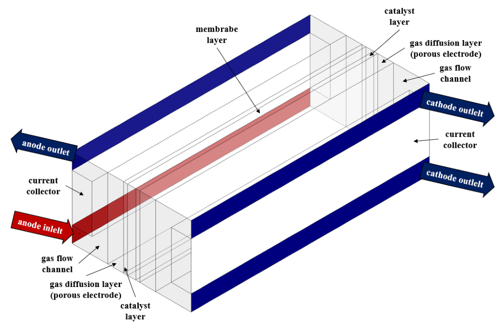 Similar to fuel cells, electrolyzers consist of two main sides called anode and cathode, which are connected by an electrolyte membrane layer. On each side of the anode or cathode, there is a current collector, a gas diffusion layer (porous electrode), and a catalyst layer.
