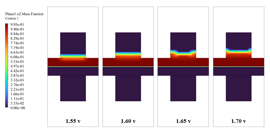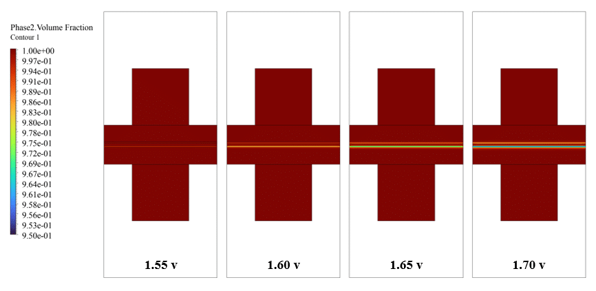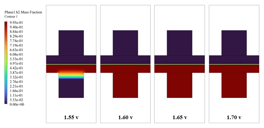 For post-processing, we obtained contours corresponding to the distributions of H2, O2, and H2O. So, we provided the volume fraction of water and the mass fraction of oxygen and hydrogen in the middle of the electrolyzer at different potentials.