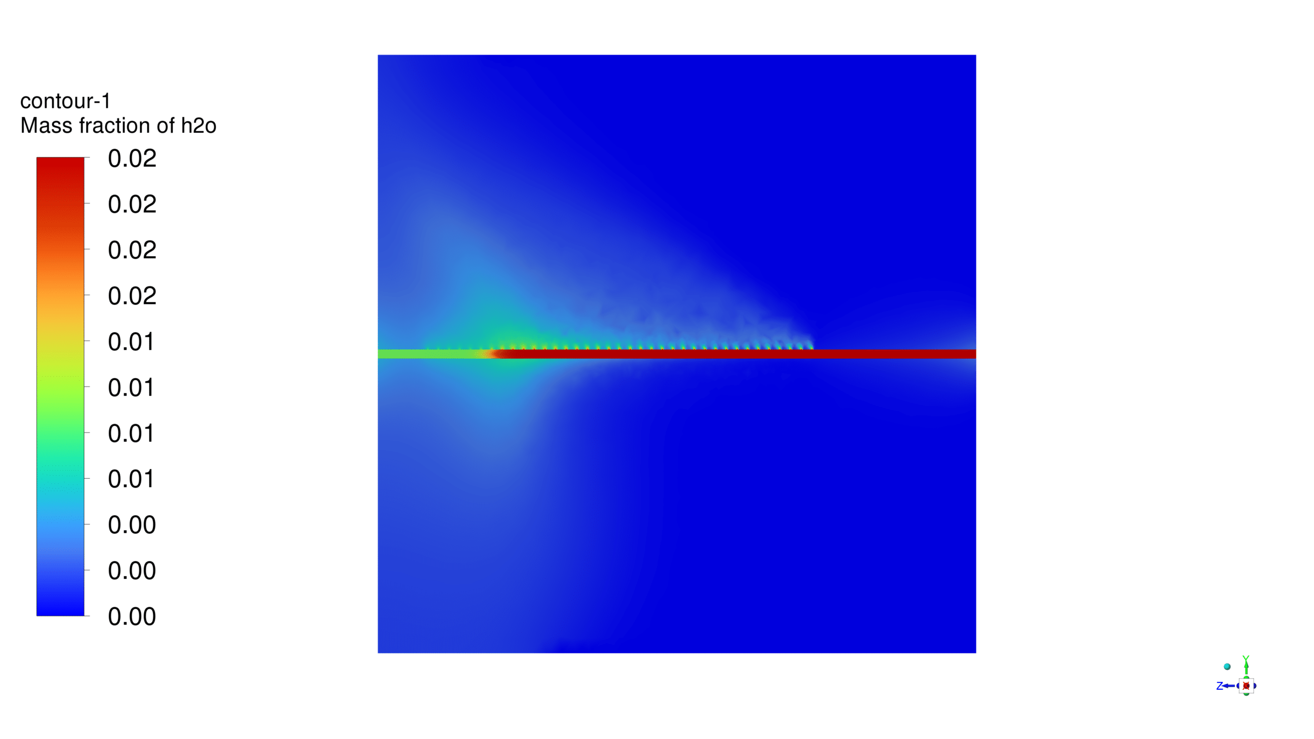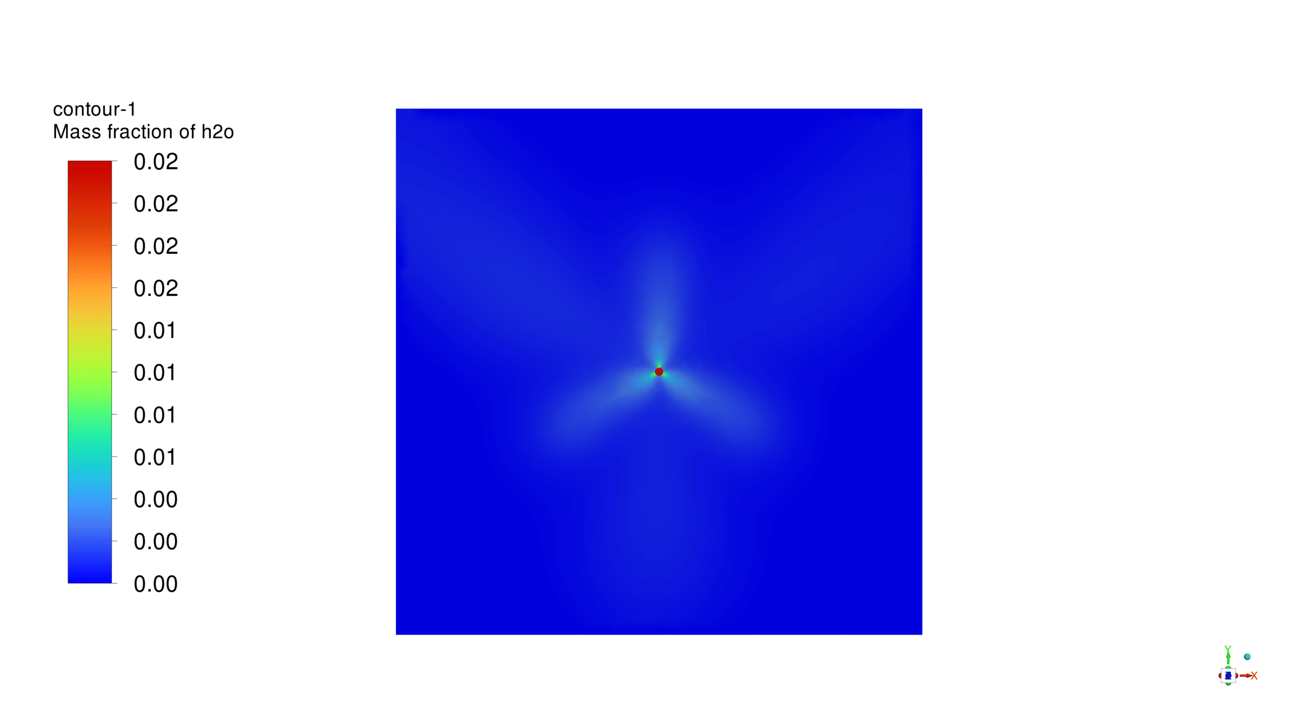 As shown in results, the velocity contours for created planes on the tube holes radially and axially, the fluid is distributed uniformly exiting the holes. Also the mass fraction of the species are visible in the contours.