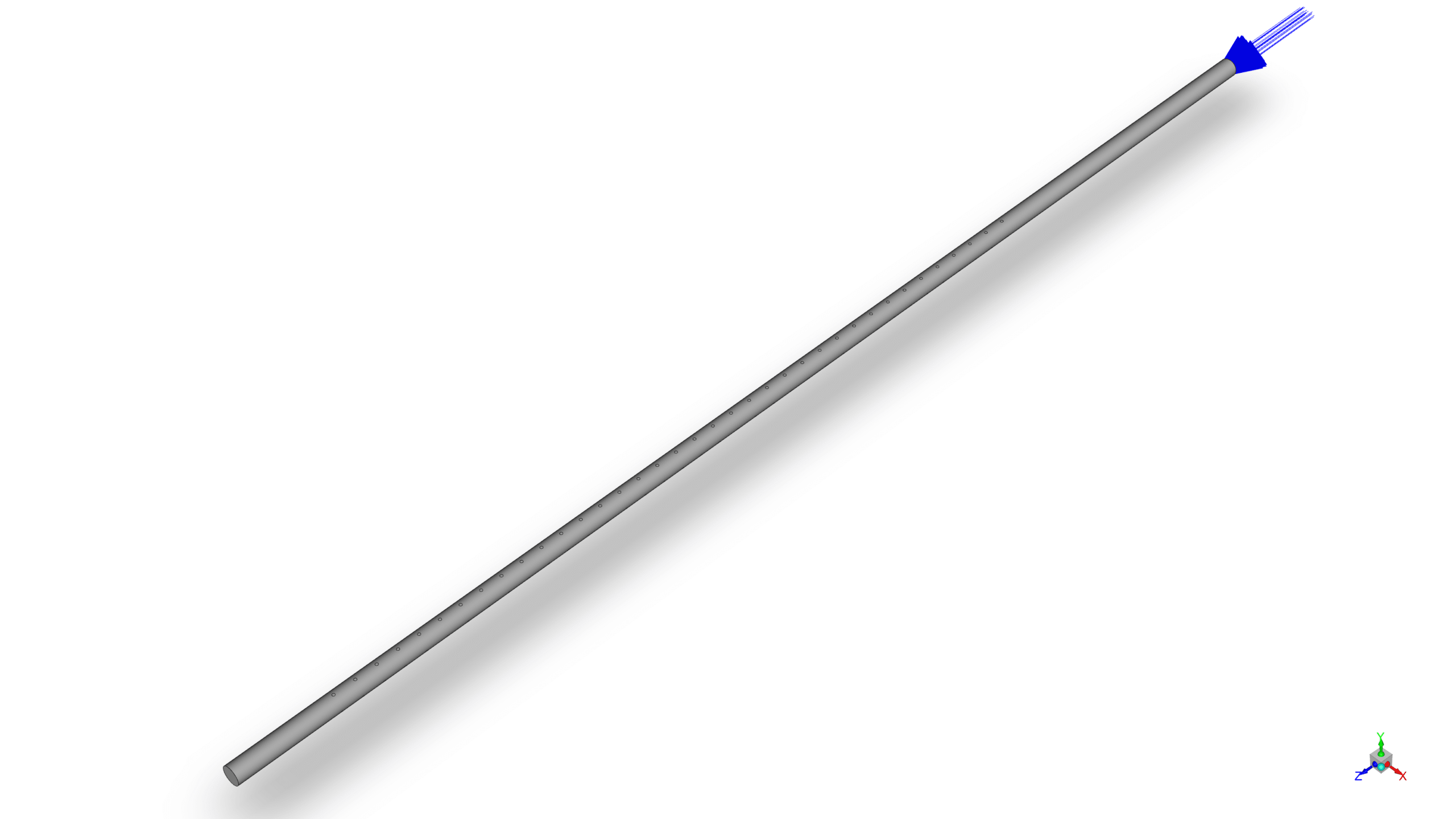 To investigate the effect of holes distance and inlet velocity, we considered different designs. In the The first one the tube with 3 [mm] diameter is simulated finding effect of varying velocity in 0.3, 1 and 3 [m/s]. Then we changed the distance between the holes to 4 and 5 [mm] so that we could observe how these parameters affect the results such as flow distribution uniformity. The air with 2.25% moisture and 300 [k] temperature enters the tube. The problem is solved steadily and turbulence of the flow is simulated by RNG k-e model. Also to see how species are transported and seeing mass fraction of them in the flow coming out of the pipe holes, the Species model is activated.