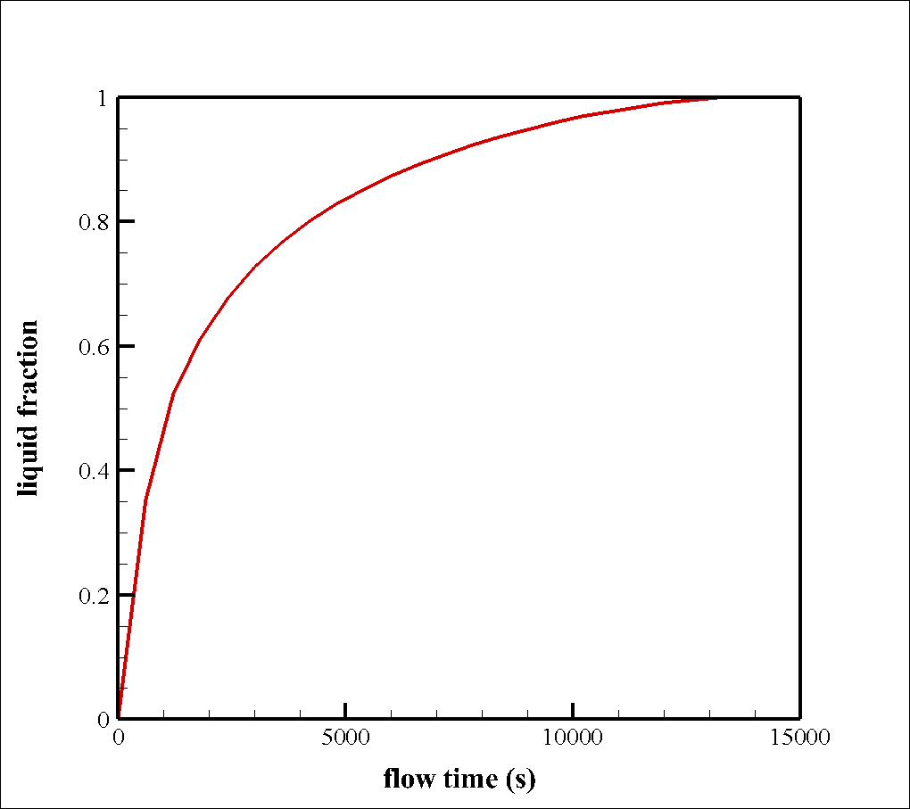 Also, a graph of changes in the amount of liquid mass fraction over time is obtained. As it is obvious, the liquid mass fraction increases in terms of time, and the solid mass fraction decreases consequently