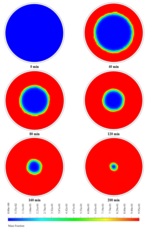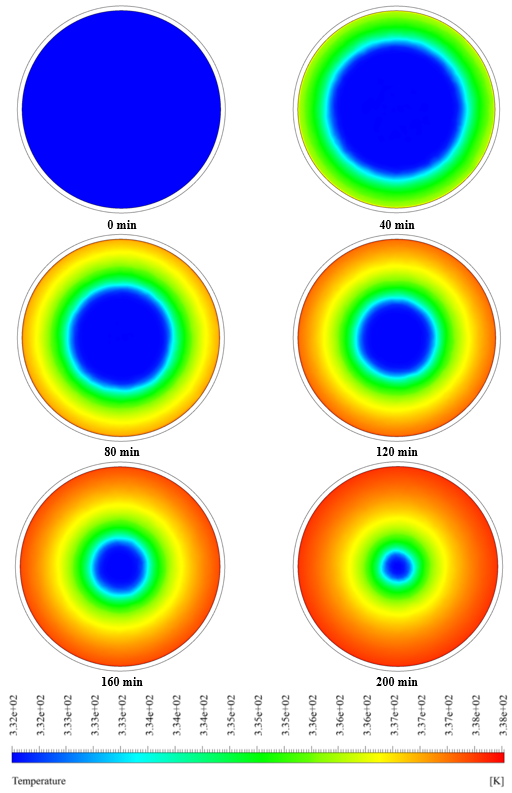 At the end of the solution process, liquid mass fraction and temperature contours were obtained at different times with intervals of 40 minutes.