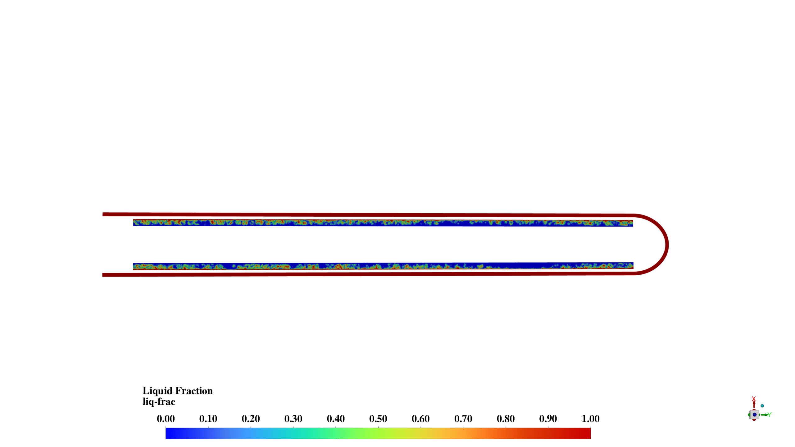 The liquid fraction contours indicate partial melting of the PCM, with higher liquid fractions observed near the water pipes. This non-uniform melting pattern suggests that heat transfer from the water to the PCM is most effective near the pipe walls, with the potential for optimization in PCM distribution or pipe design.