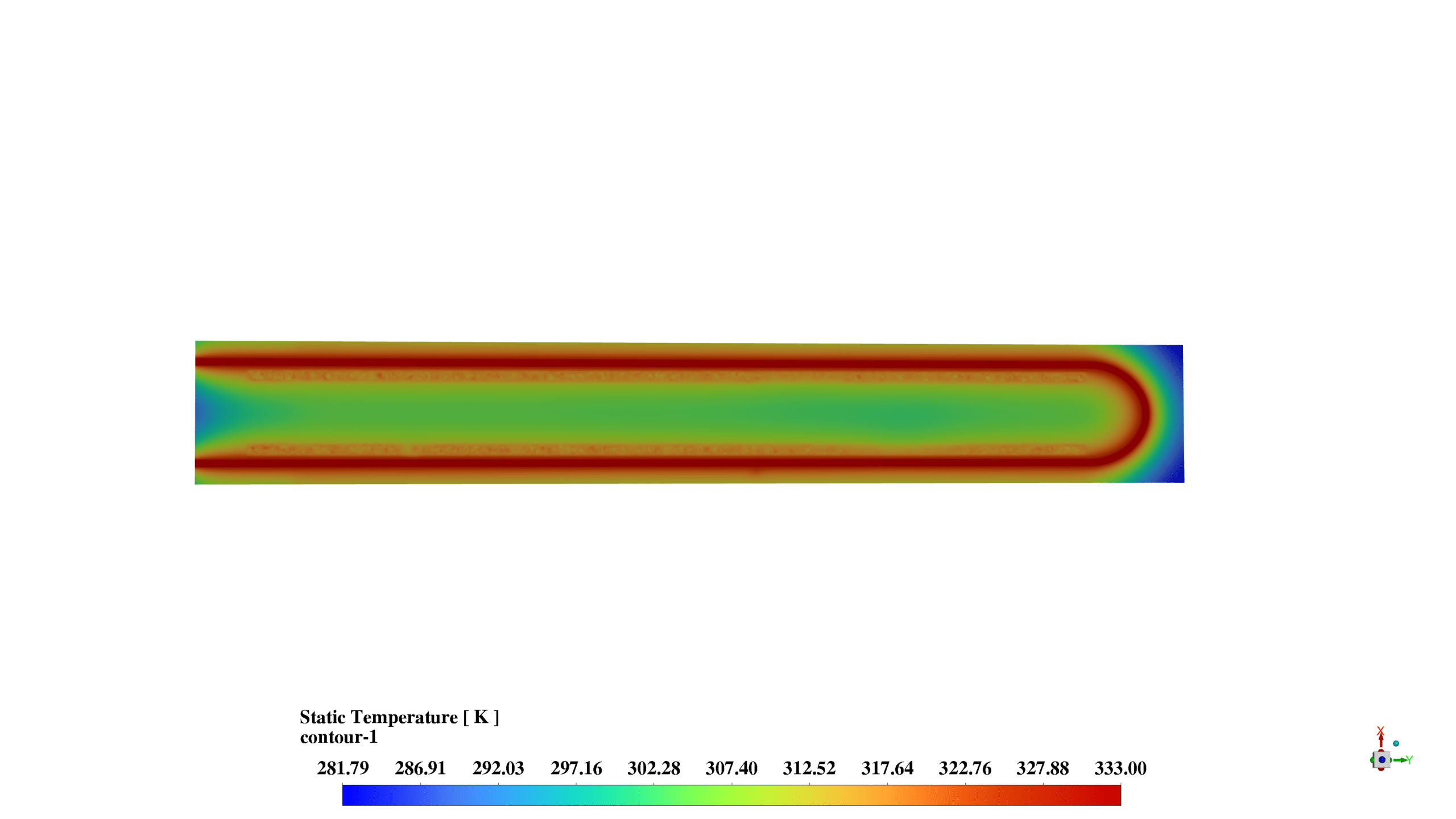 The volume average static temperature in the PCM1 and PCM2 zones reached 316.759 K, approaching but not quite reaching the solidus temperature of 317.2 K. This indicates that the PCM has absorbed a significant amount of heat but has not fully melted. The liquid fraction in the PCM pipes was 0.316, confirming partial melting and demonstrating the PCM’s effectiveness in absorbing latent heat.