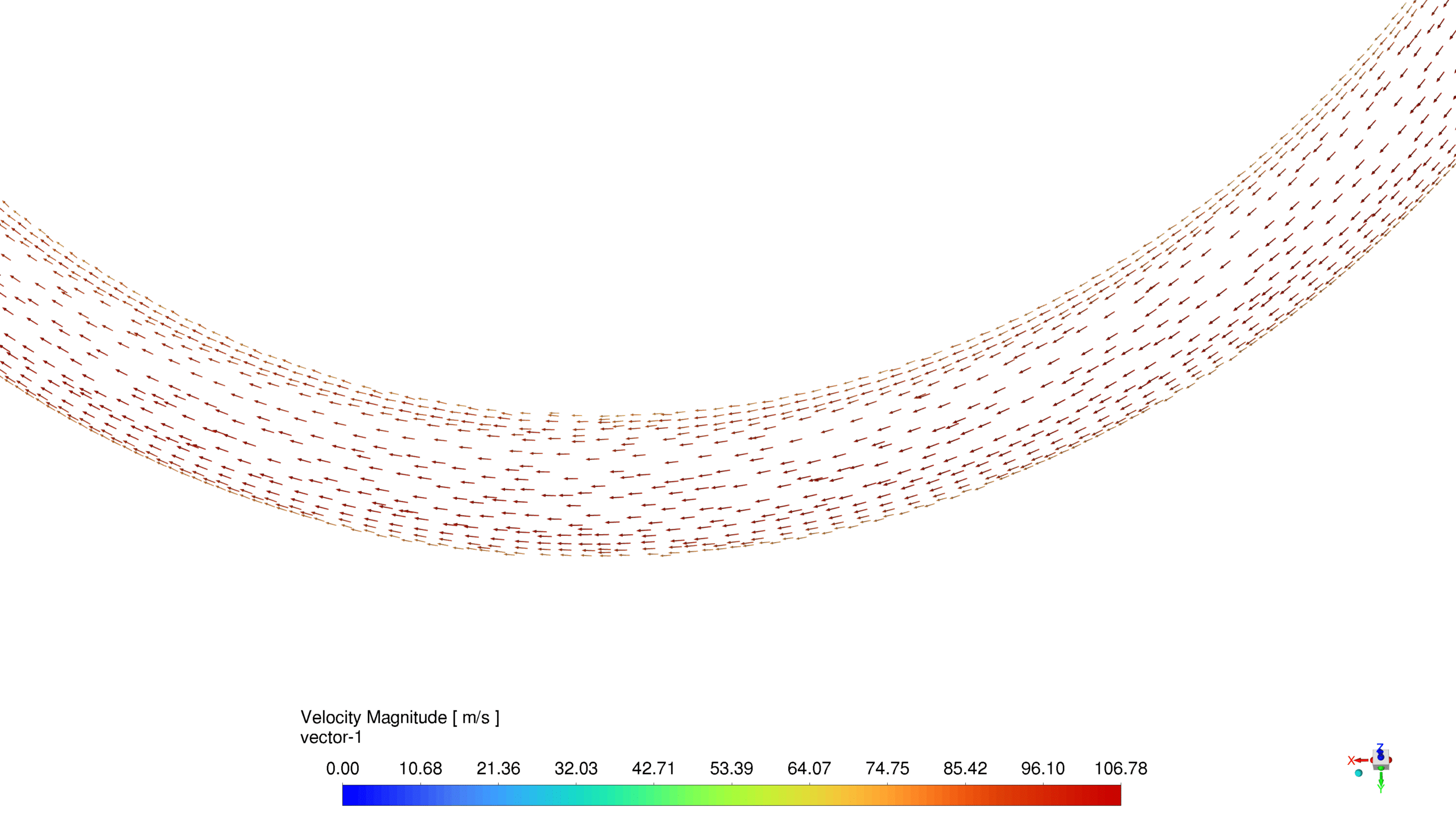 Furthermore, the velocity magnitude contours and vector plot reveal complex flow patterns, particularly in the U-bend region. The maximum velocity observed was 106.62 m/s, occurring in the U-bend. This high velocity suggests a potential for enhanced heat transfer due to turbulence but also indicates the need for careful consideration of pressure drop and pumping requirements in system design.