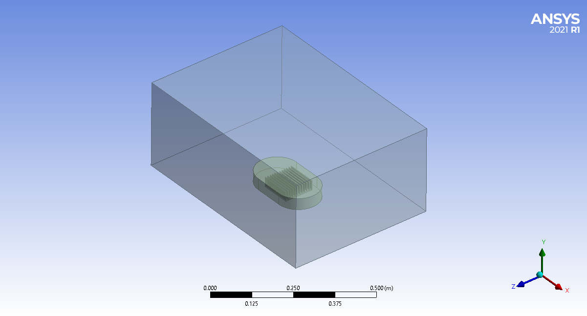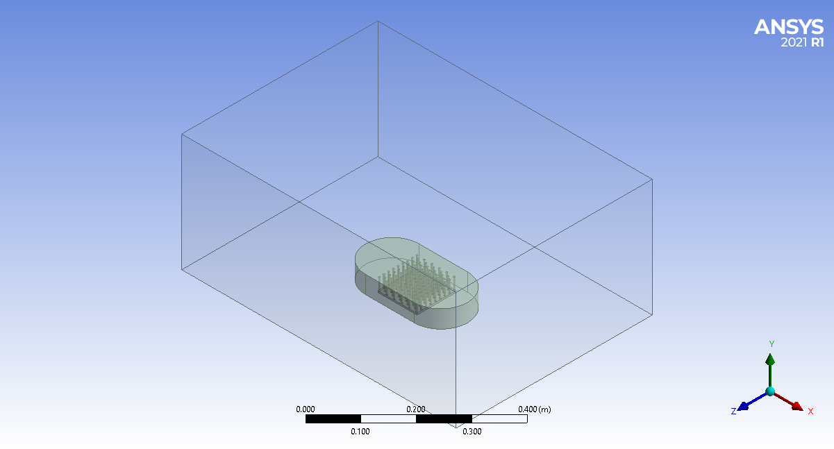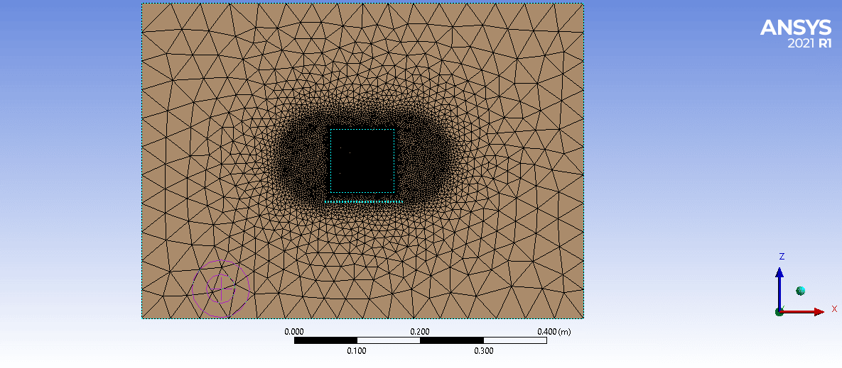 The 3-D domain of this simulation has been designed in ANSYS Design Modeler. The meshing of this present model has been generated by ANSYS Meshing software. The mesh grid is unstructured. The figure below shows an overview of the performed mesh.