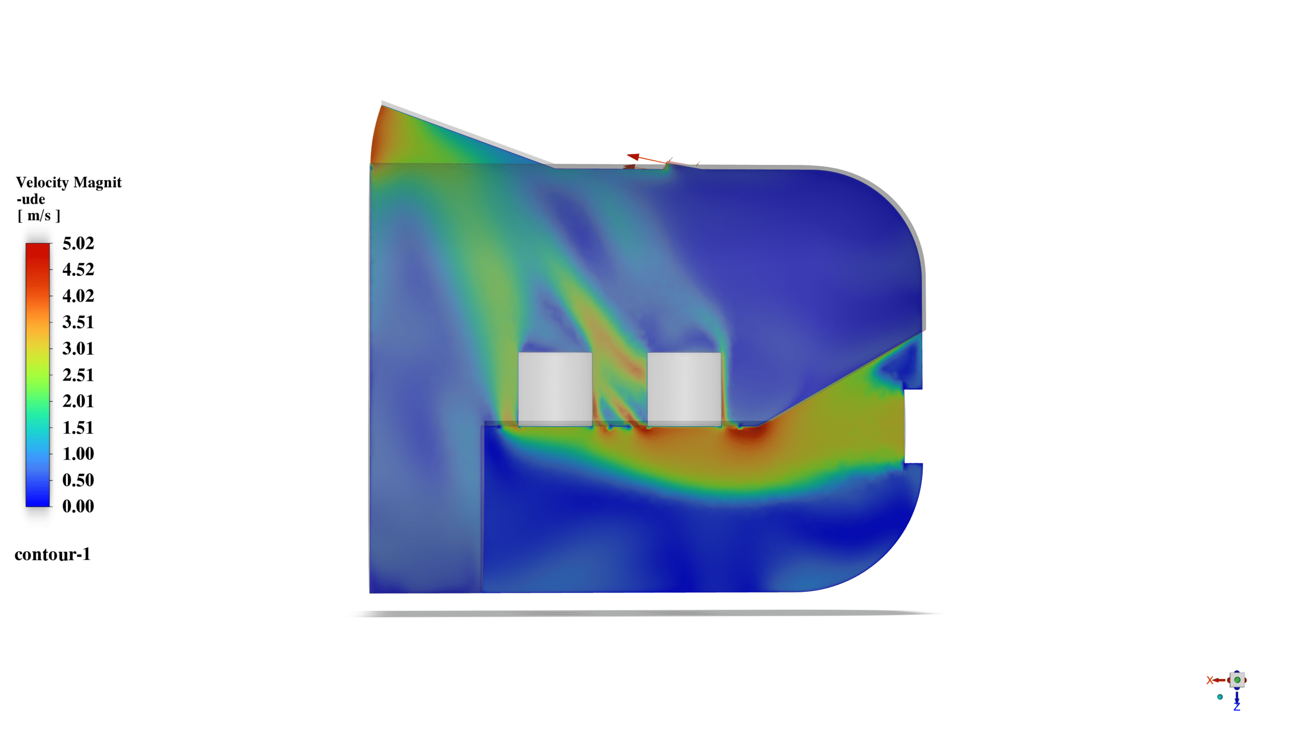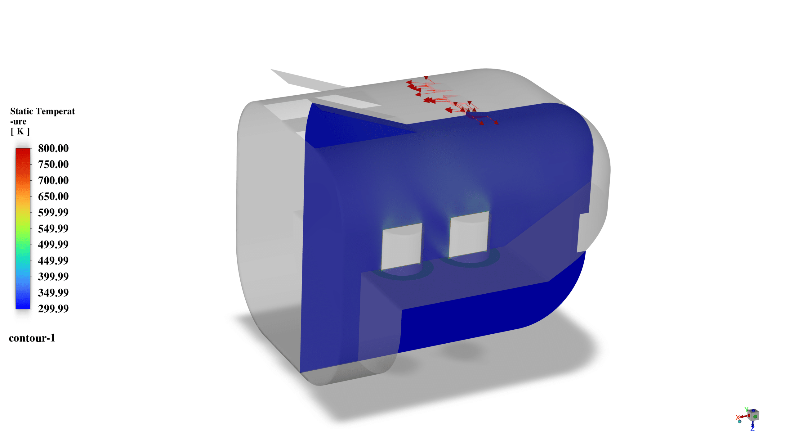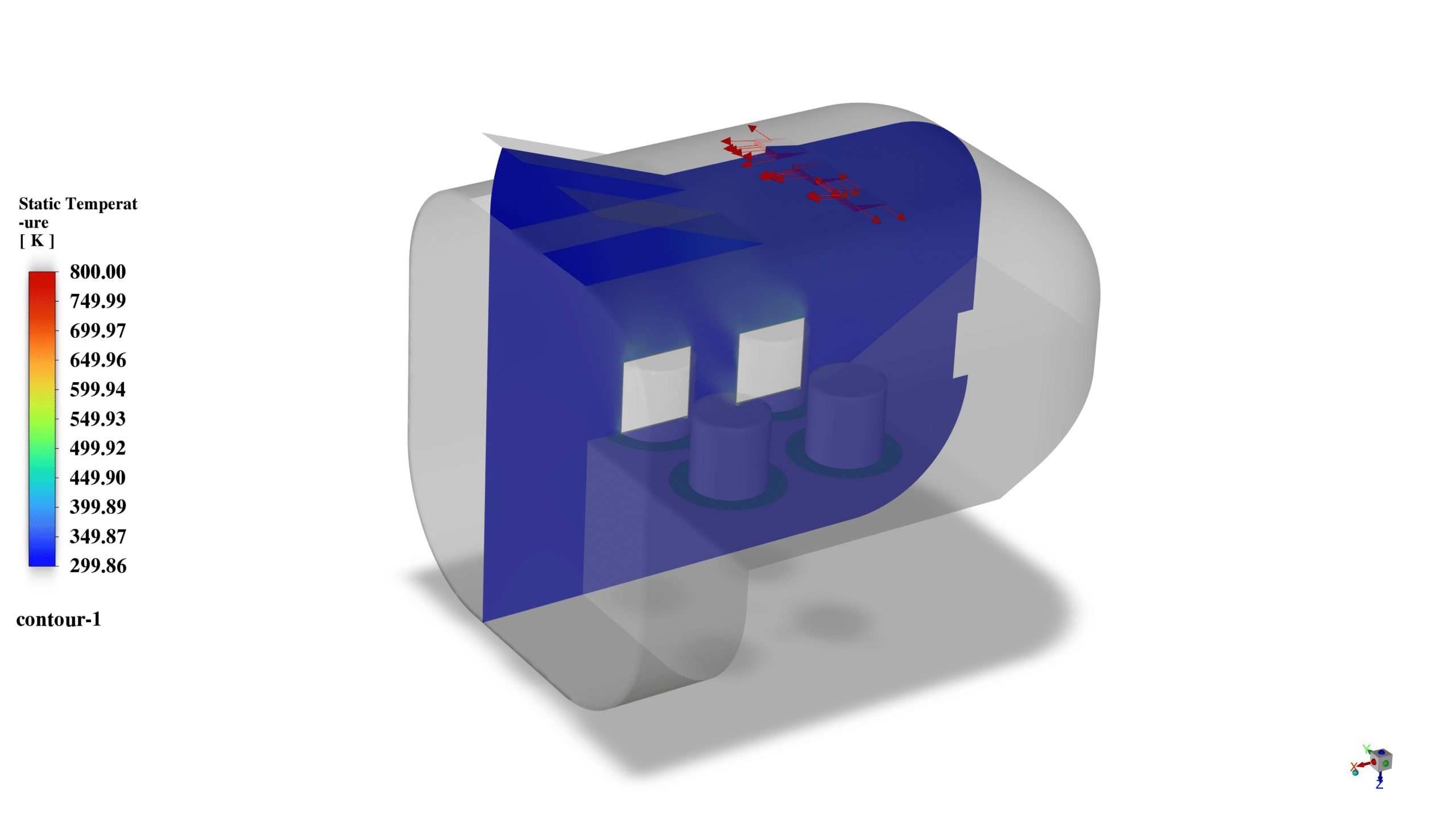 In conclusion, the CFD simulation successfully captured the thermal and fluid dynamics behavior of the pin-fin heat exchanger. The results demonstrate the device’s ability to transfer heat from the high-temperature pins to the working fluid, with complex flow patterns enhancing heat transfer efficiency. The study highlights the importance of pin arrangement, flow distribution, and outlet configuration in optimizing heat exchanger performance. Further studies could explore different pin geometries, arrangements, or working fluids to enhance thermal management capabilities.