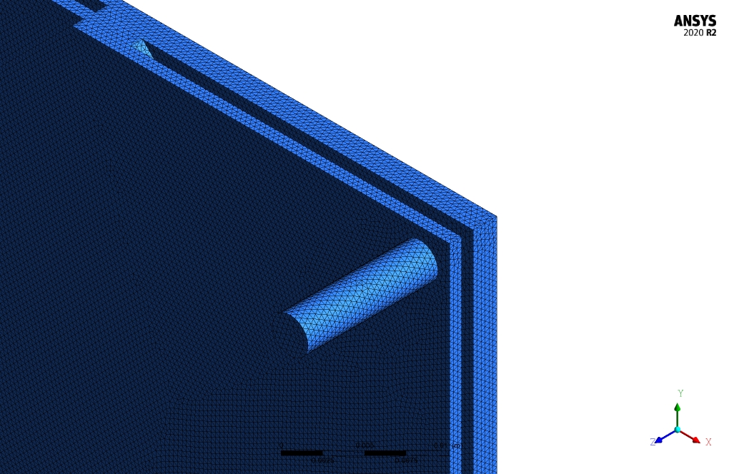 The geometry of the heat exchanger is designed in Design Modeler, and grid generation is done in Ansys meshing. Inlet and outlet boundary conditions of both hot and cold flow are shown below. The mesh type is unstructured, and the element number is 2273000.