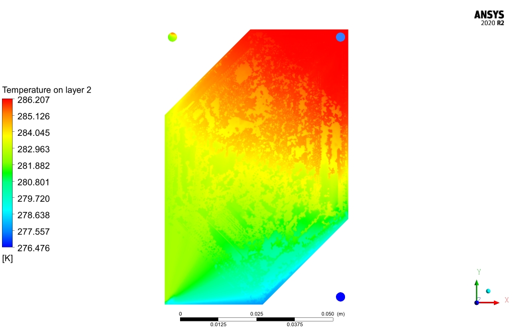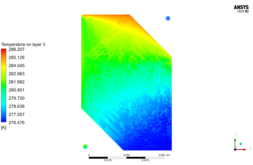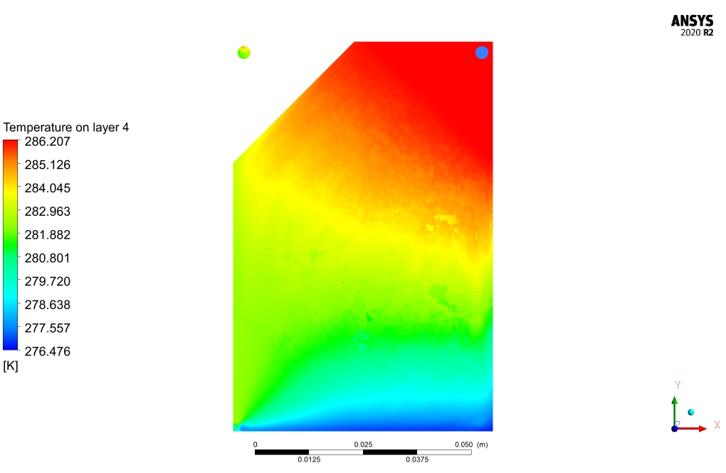 Results, including temperature, velocity, and streamlined contours, are obtained for each of the 4 layers. Layers are planes parallel to XY Plane, which are assigned 1 to 4 as the increase of their Z. Layers 1 and 3 are regions where cold flow is heated up, and layers 2 and 4 are regions where hot flow is cooled down. The hot flow’s temperature at the inlet and outlet is 286.2 K and 281.213 K, respectively. Cold flow’s temperature at the inlet and outlet is 276.5 K and 282.725 K, respectively. It can be obtained that the heat transfer rate from the hot flow is equal to 93.8503W, and the heat transfer rate from the cold flow is equal to -93.9754W, which can be taken as equal with reasonable approximation.