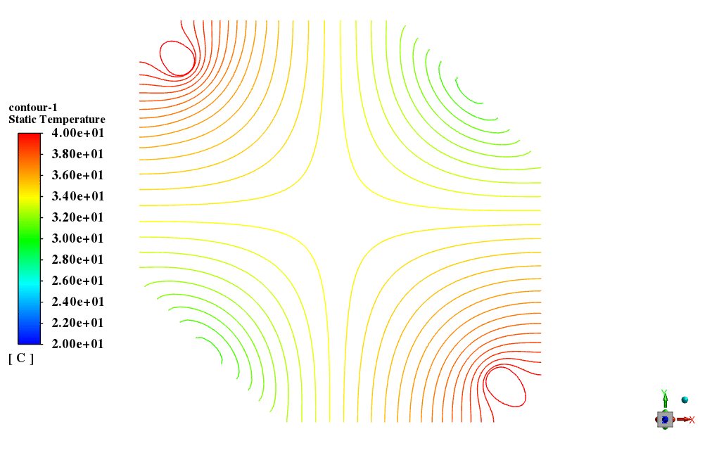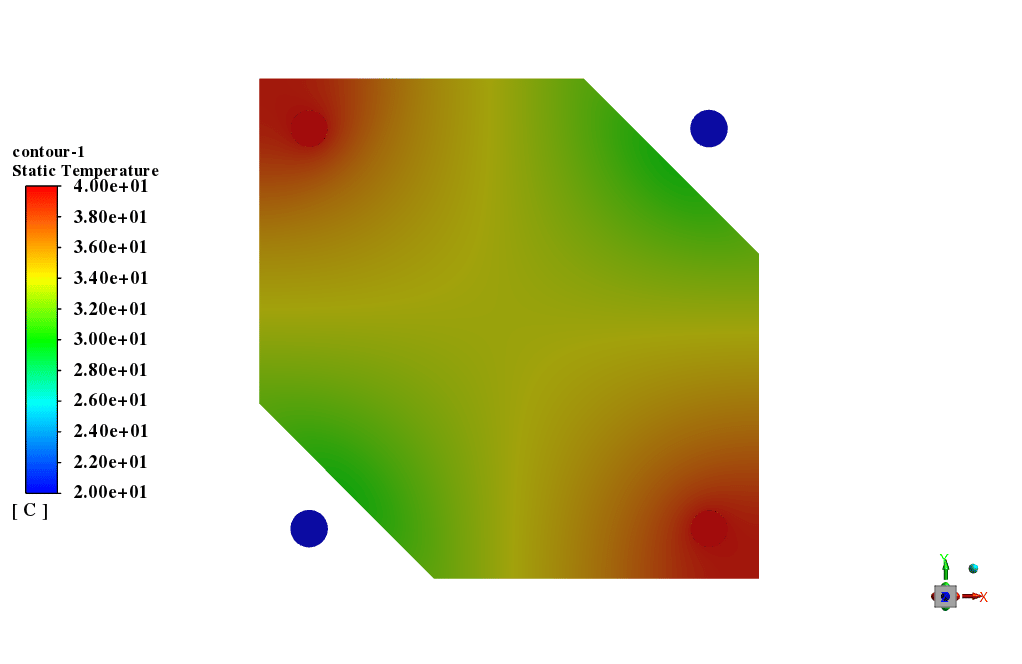 In this project, four solid plates are modeled while four pipes are placed at the corner of the plates. The fluid (water) flows through the pipes at the same velocity and at different temperatures (20 & 40 Celsius) in reverse directions.