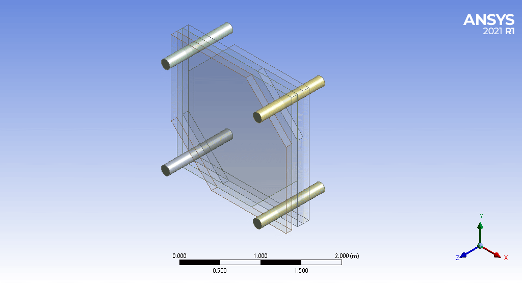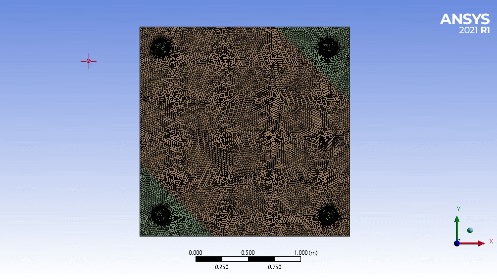 The geometry of the solution is designed in Design Modeler software, while all the solids are from one single part. The solids are 2*2m, and their thickness is 0.2m; the pipe’s diameter and length are 0.2m and 1.1m, respectively. Ansys meshing software is used for generating meshes of the solution. The elements are unstructured, and the number of elements is 2216379.