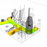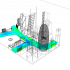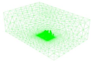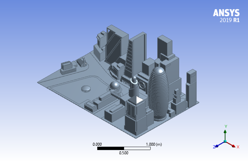 The present model is three-dimensional and is drawn using the Design Modeler software. This model is a set of structural elements consisting of several building blocks and a street belonging to a city. An area in the shape of a rectangular cube with dimensions of 9 m ⨯ 13 m ⨯ 4 m is designed around this urban complex. The airflow inlet is selected in three lateral sections of this area. There is also a 0.1 m high area on one of the city streets. The following figure shows a view of the geometry.
