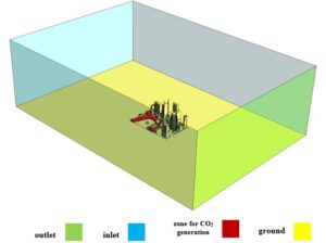 Free airflow enters the area around an urban environment at a velocity of 0.2 m.s-1 and a temperature of 300 K. Since the CO2 and airflow are modeled, the Species Transport model has been used; Thus, these gaseous species include air and CO2. The amount of carbon dioxide produced in the definition area on the street is 4 kg.m-3.