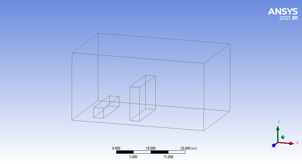 There are two buildings; the first is by the length of 3m, 3m, and 15m in positive X, Y, and Z directions. The second is 3m, 10m, and 15 in the same direction. Design Modeler software is used to create the geometry of the solution. ANSYS Meshing software is used to generate 274,496 structured elements.