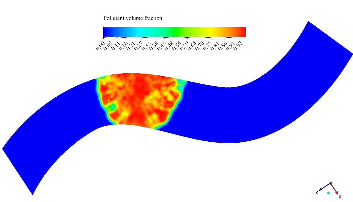 The VOF multiphase model is used to simulate the phases of water and pollutant. Pollutant enters the river from a nonuniform profile somewhere in the middle of the river and diffuses into the water.