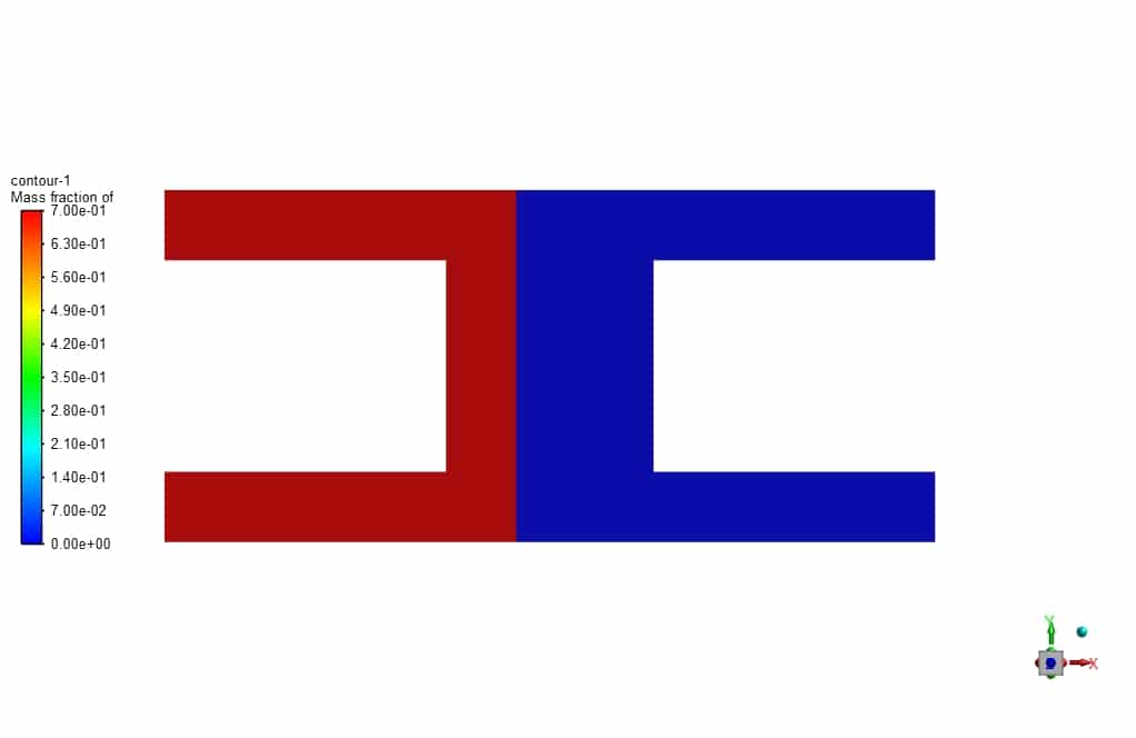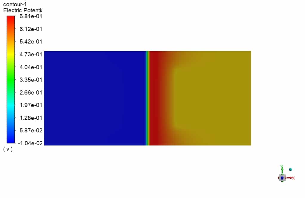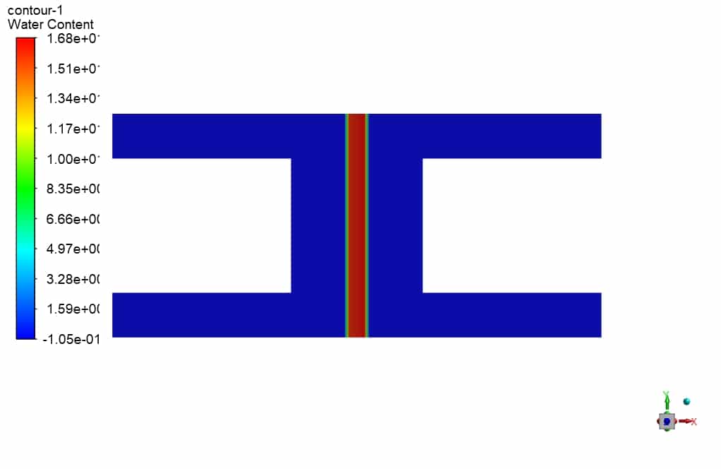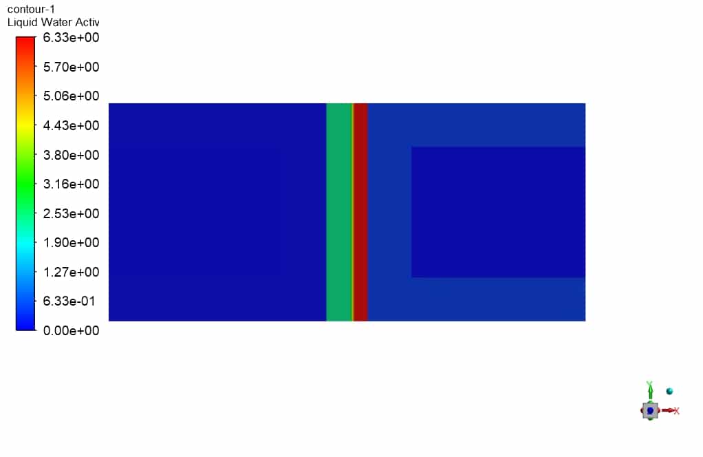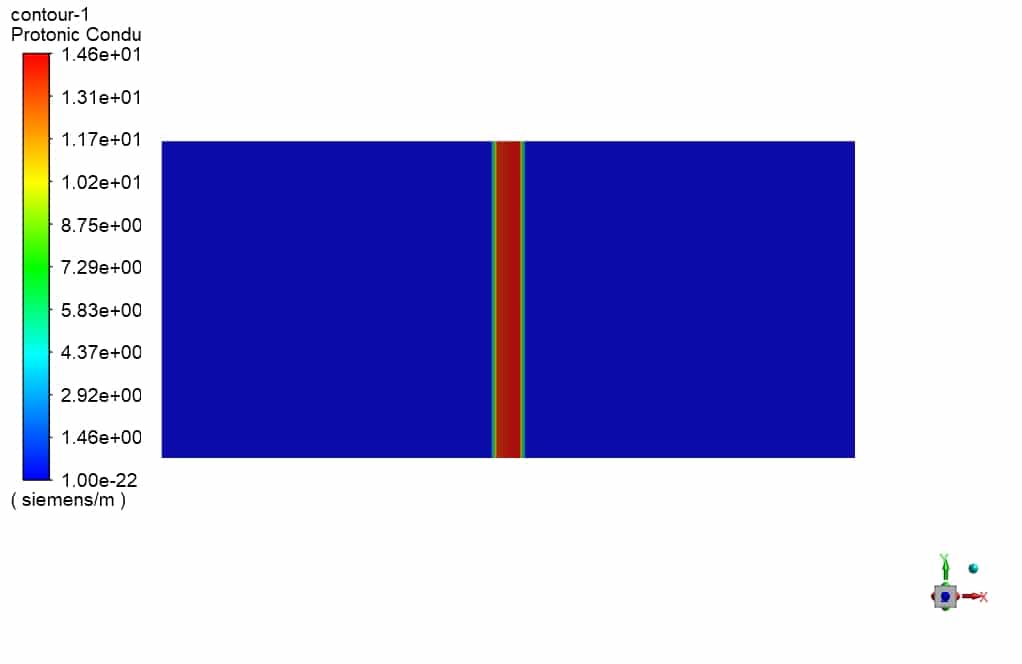 After the simulation process, results are shown in the form of contours. The hydrogen and oxygen react, and this process leads to the electric current generation. The electrolyte membrane acts as a bridge between cathode and anode, and the catalytic layer boosts the transmission.