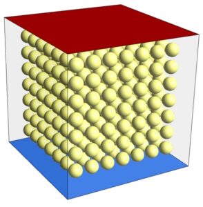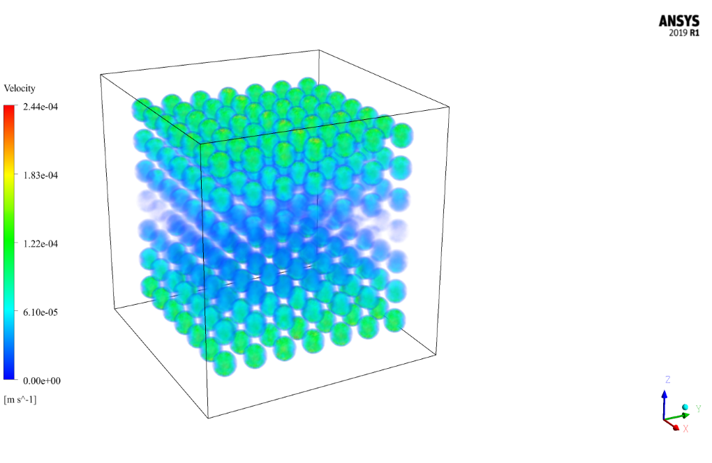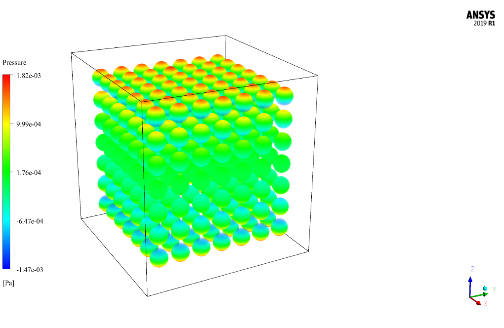 The problem simulates the airflow and heat transfer inside a cube-shaped chamber consisting of a regular porous medium by ANSYS Fluent software. The porous medium used in this chamber is in the form of rows and columns of several aluminum balls, the number of which is 343. These aluminum balls have a density of 2719 kg.m-3, a specific heat capacity of 871 j.kg-1.K-1, and thermal conductivity of 0.5 W.m-1.K-1.