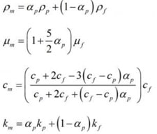 A coupled algorithm was applied in the pressure-velocity coupling, and a model (Realizable-Standard) was chosen as a turbulence model. Nanofluid is modeled as a single-phase fluid with modified thermophysical properties. These properties are calculated using the formulas below. Mixers are simulated as porous mediums of aluminum with porous permeability equal to 1.