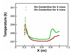 As we can see from the diagram, for the 4-row case, the temperature has a higher value in the center of the geometry due to the more significant number of separation zones.