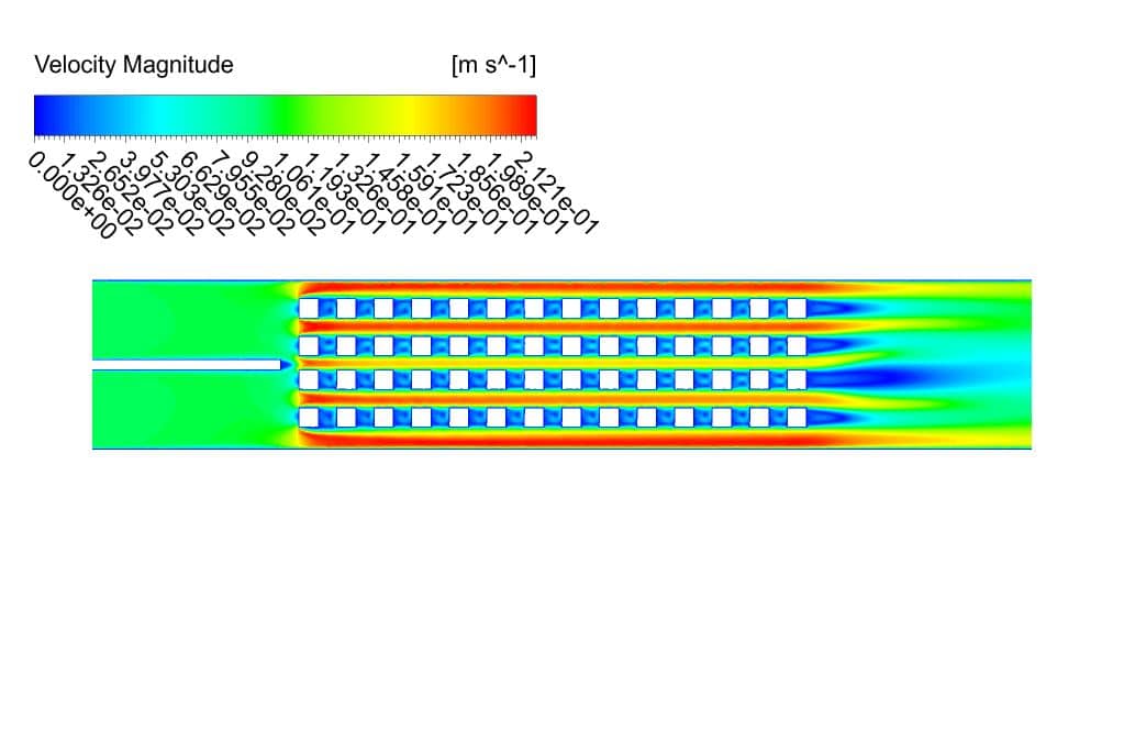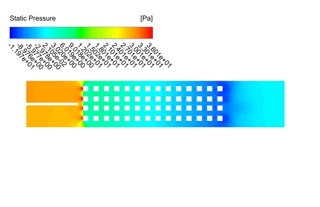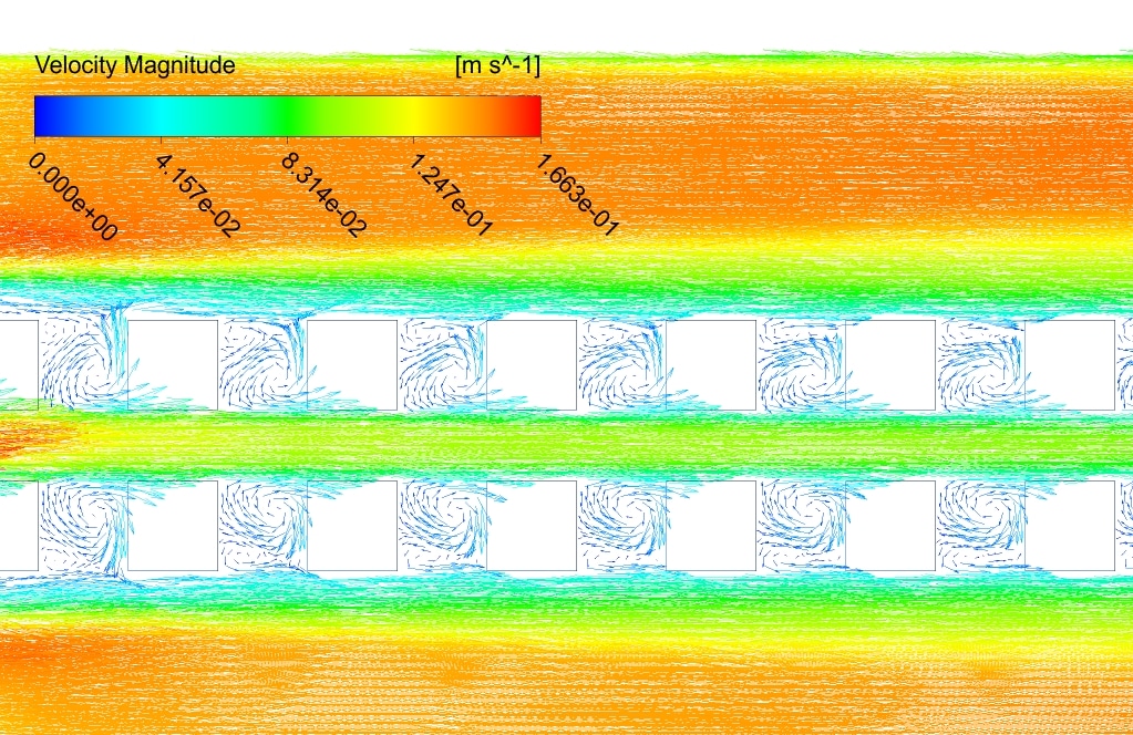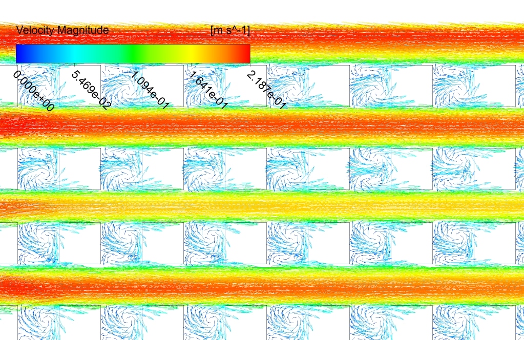 This indicates that although the number of separation zones is higher in the 4-row case, the separations are more substantial in the 2-row case. The pressure gauges also show that the pressure is more negative for the 2-row case. This is also understandable from Bernoulli’s equation.