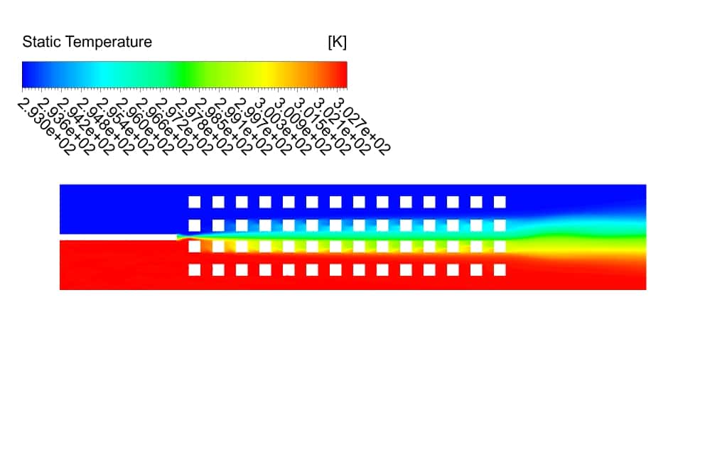 In this project, mixing hot (303k) and cold (293) nanofluid flows were investigated while mixing these two streams once using 28 mixers and once using 54 mixers modeled as a porous medium.