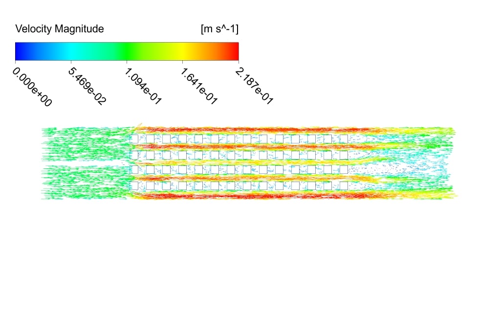 The reason can be attributed to the smaller number of cubes and, as a result, less change in velocity gradient (due to the collision of the flow with the sharp edges). The maximum and average speeds are higher in the 4-row case.