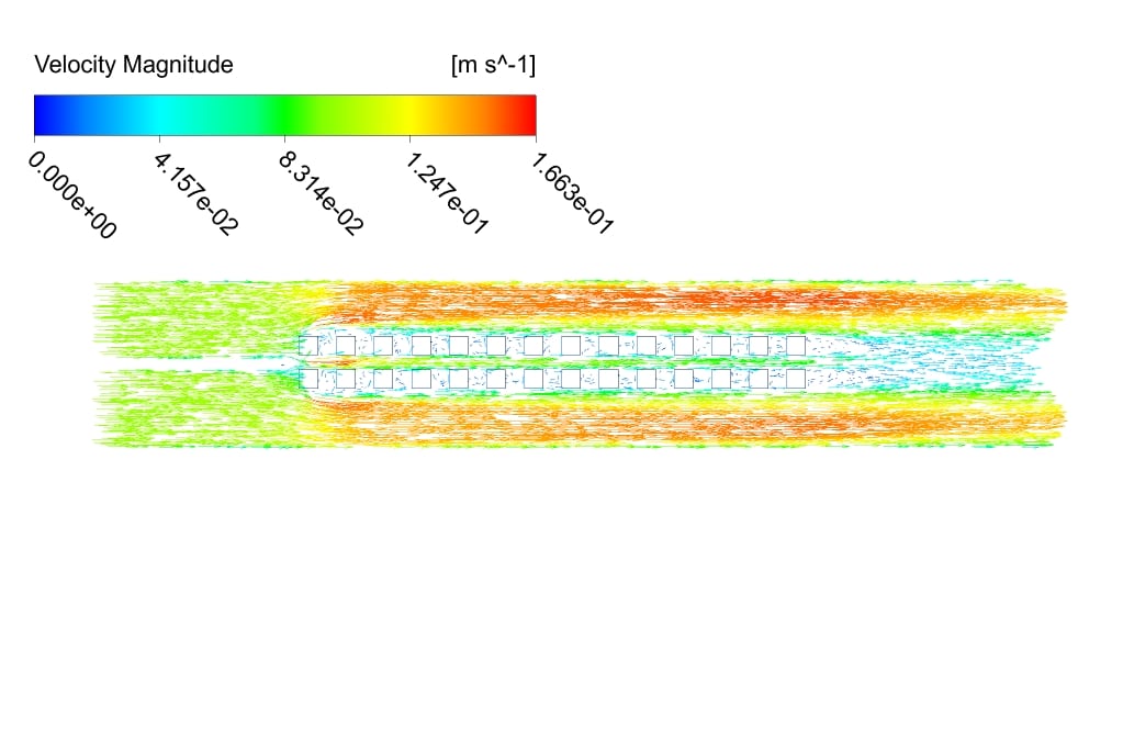 The velocity, static pressure, temperature contours, and vectors are obtained. As you can see from the pictures, the velocity contour is more uniform for the 2-row case.