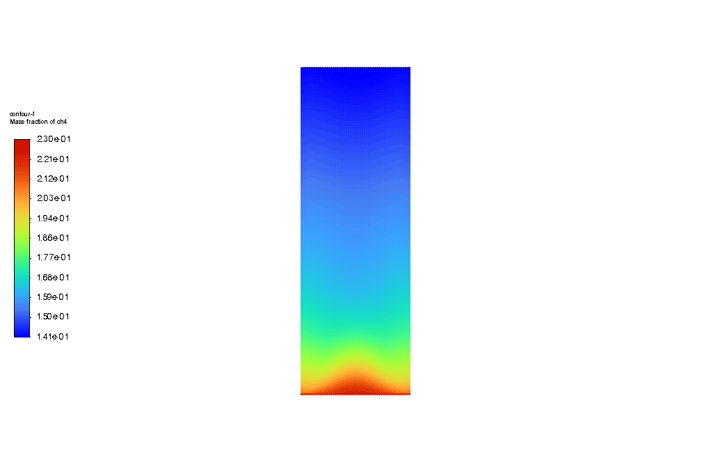 The mixture flow enters the domain with a 0.23 methane mass fraction and 0.77 oxygen mass fraction. Then, using the ignition spark sub-model, the combustion process starts.