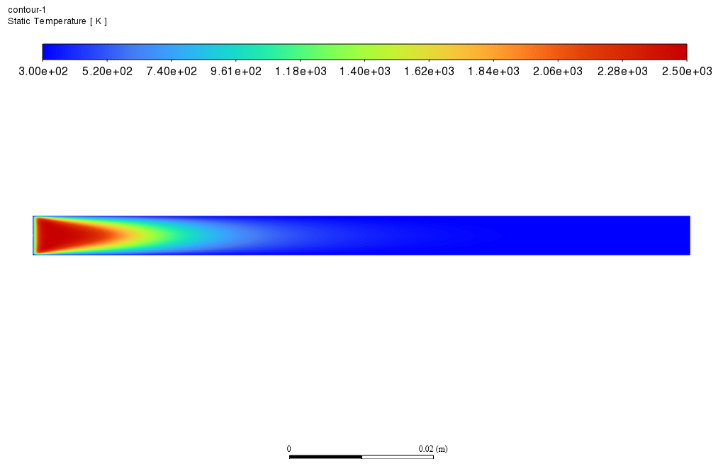 After the simulation process was finished, contours such as temperature, velocity, different species’ mass fractions, and streamlines were obtained. As shown in the temperature contour, the temperature has increased in the chamber, indicating that combustion has occurred.