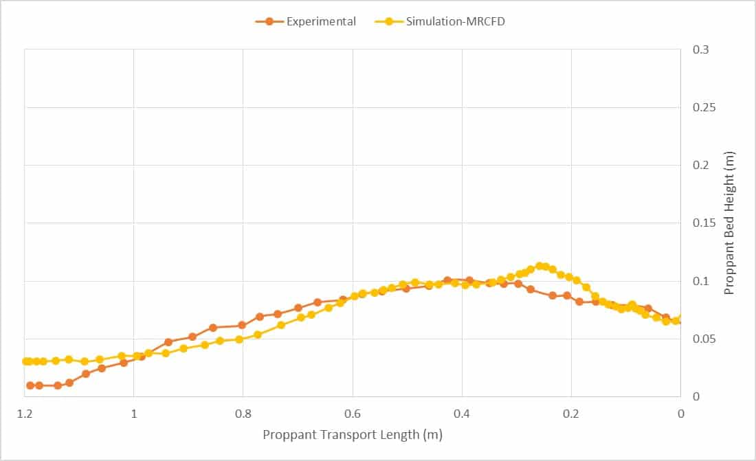 After 17 seconds of simulation, the dune height was almost two times higher than that of 10 seconds. In order to test the accuracy of the simulation, the experimental results that show proppant volume fraction are selected to compare with simulation results. As the figure below shows, the results indicate a good agreement. Based on the measured data, the error is below 12%.