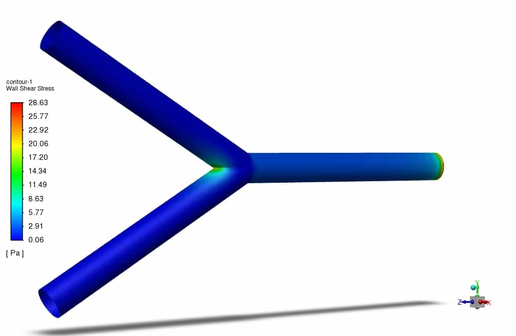 Another interesting conclusion to make from the results is the regions that are most likely to form stenosis. In literature, areas with low Wall Shear Stress (WSS) are most likely to form stenosis. As shown in the figure illustrating the WSS values, the most likely region for stenosis formation is the tip of bifurcation.