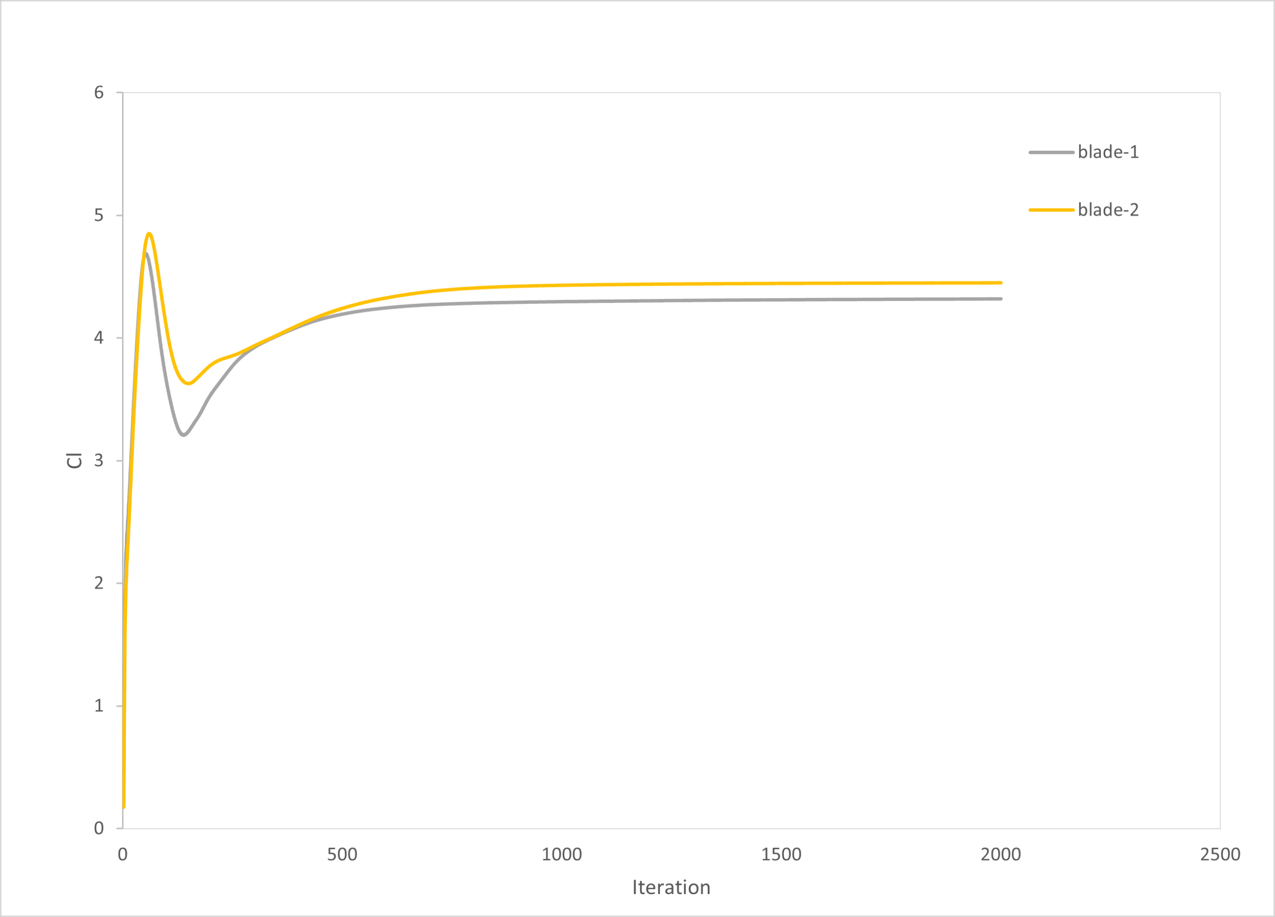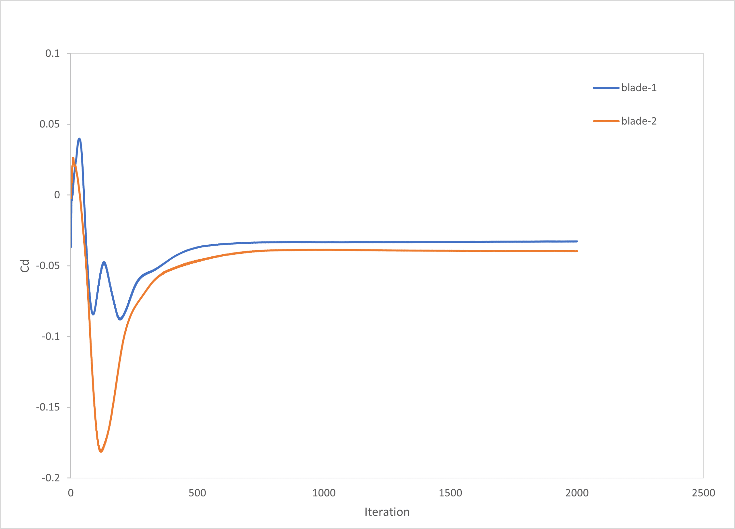 Both blades converge to slightly negative drag coefficients (–0.07 to –0.08). This is a numerical artifact of thrust-producing propellers, where the force is aligned opposite to the freestream axis used in post-processing. In reality, this represents net thrust generation. Blade2 has a slightly more negative drag coefficient (more thrust contribution), which correlates with its higher lift.
