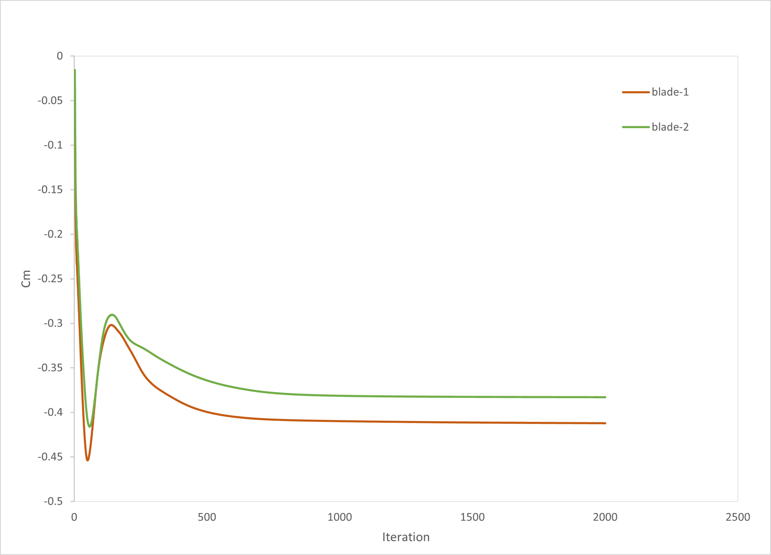 Both blades have negative pitching moments, meaning the aerodynamic forces create a nose-down torque tendency. Blade1 has a more negative (Cm) than Blade2, indicating it is less aerodynamically balanced.