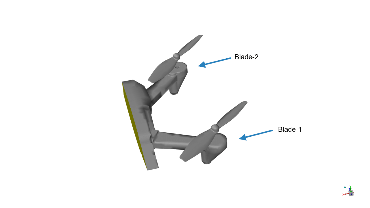 In Quadcopter Aerodynamic Analysis, we employ ANSYS Fluent software and leverage the applications of Computational Fluid Dynamics (CFD) to determine the surfaces that create lift and drag forces. In this simulation, to capture the rotational motion of the quadcopter blades with an angular velocity of 1200 RPM, we employed two frame motion zones. These zones allowed for accurate simulation of the blade dynamics and airflow characteristics around the quadcopter.