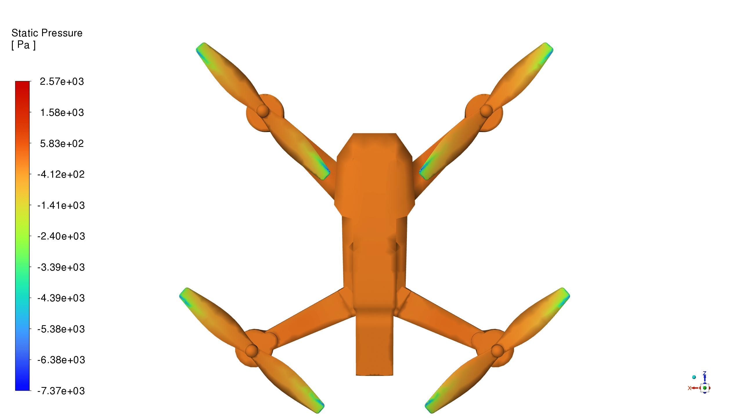 Strong suction (blue, low pressure) develops on the upper sides of blades. The blades closer to the body arms show weaker low-pressure regions, proving that arm interference reduces effective lift.