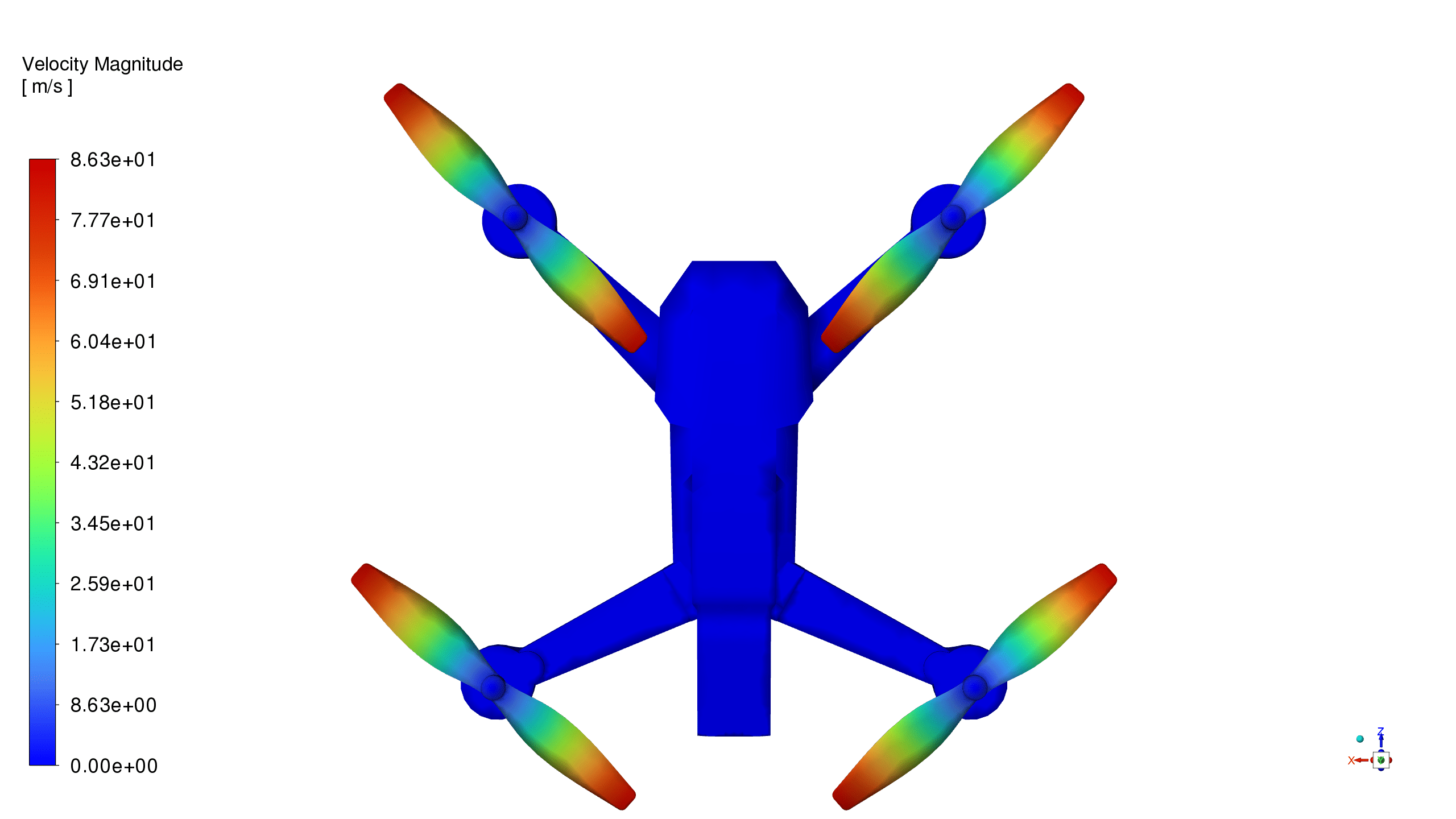 Tip regions show the highest velocities (85 m/s), which is expected due to rotational speed and induced vortex effects. Non-uniform velocity distribution across blades again reveals that some blades operate in cleaner air, while others suffer from flow blockage by the quadcopter body/arms.