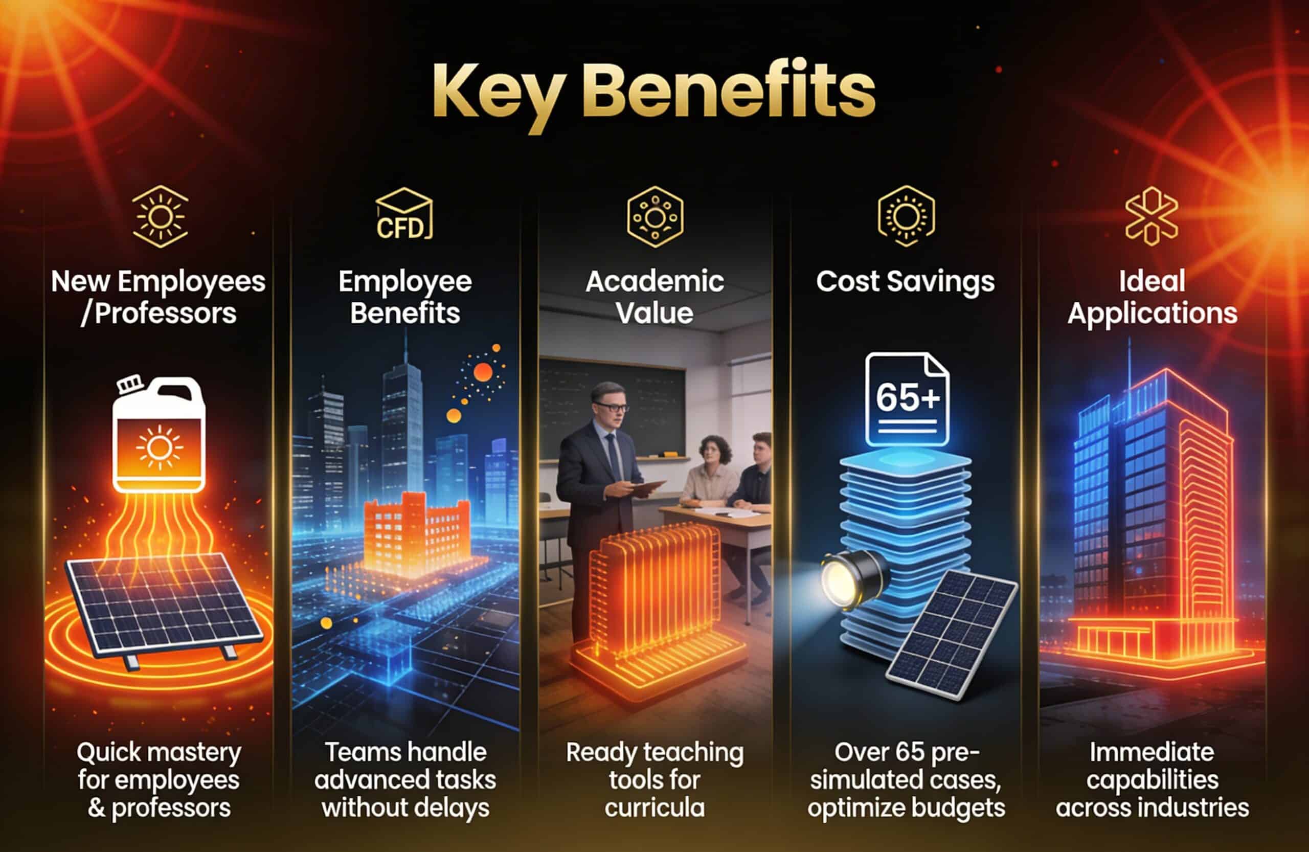 Organizations bypass custom training by leveraging over 65 pre-simulated cases, from Headlight CFD Simulation to Solar Collector, optimizing budgets. Continuous updates maintain relevance across all Radiation challenges.