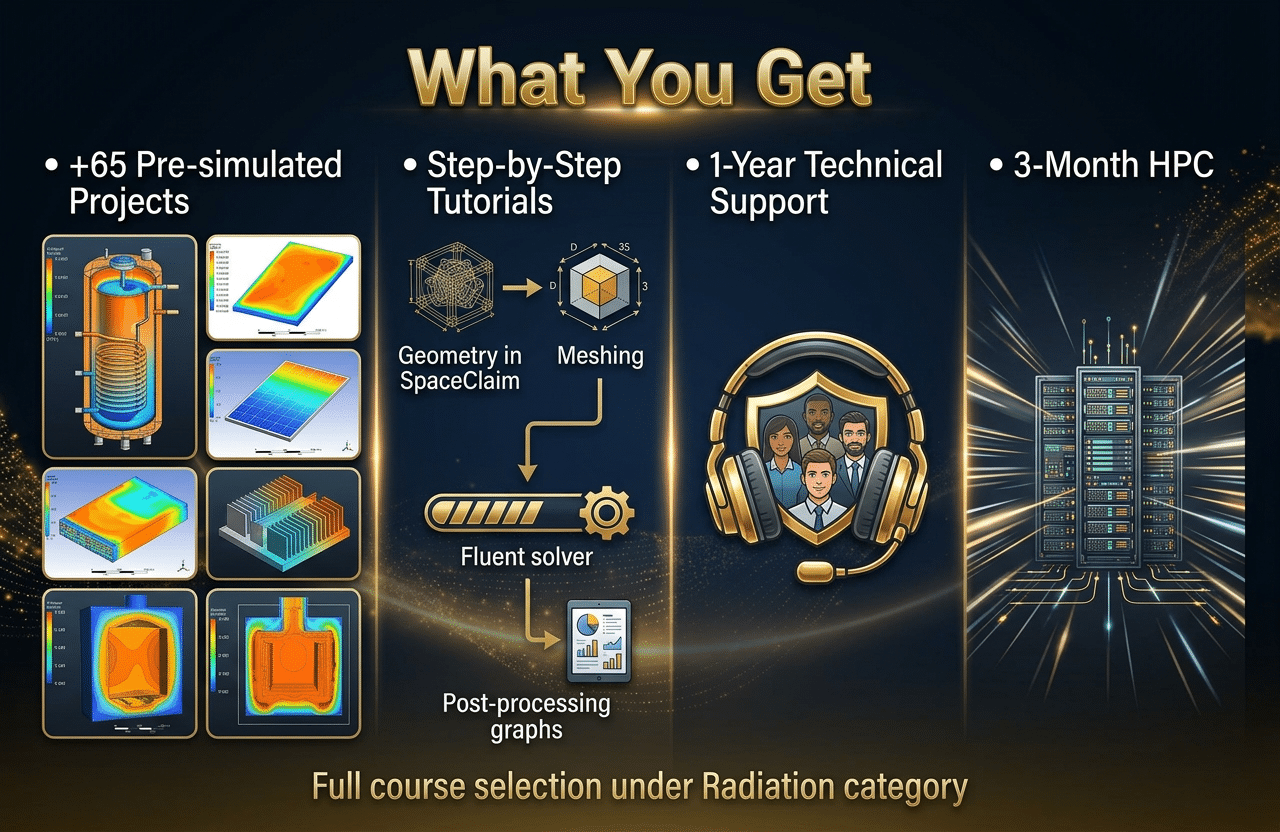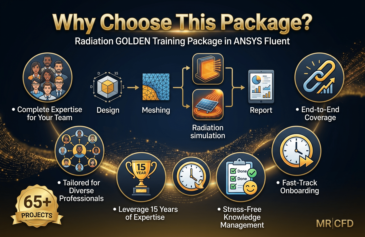 Empower your engineering team with MR CFD’s extensive “Radiation GOLDEN Training Package.” Designed for university professors, CEOs, managers, institutes, and major companies, this collection of more than 65 ANSYS Fluent CFD Simulation tutorials turns beginners into proficient users, ready to tackle projects in the advanced Radiation fields and industries applying major Radiation models such as Discrete Ordinates (DO), DTRM, P1, Rosseland, Surface to Surface (S2S), and Monte Carlo.