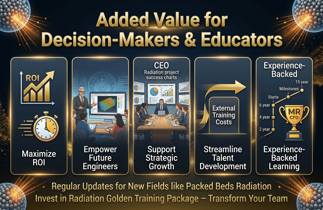 Packages receive regular enhancements for new project fields like Packed Beds Radiation, ensuring perpetual relevance without extra investment. Invest in MR CFD’s “Radiation Golden Training Package” and transform your team into Radiation engineering experts ready to meet today’s and tomorrow’s engineering challenges. This turnkey solution empowers your organization to innovate faster, reduce risk, and secure a competitive edge with confidence.