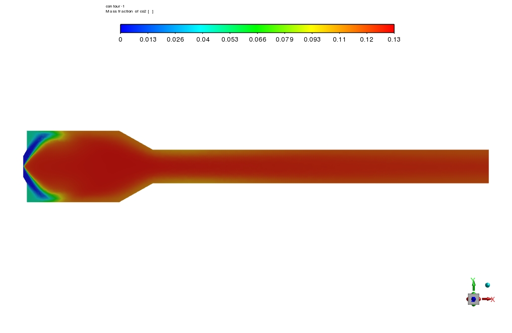 Also, the occurrence of the combustion process is clear in species mass fraction contours. For instance, the CO2 mass fraction contour shows how the mass fraction of CO2 increases suddenly due to the combustion process.