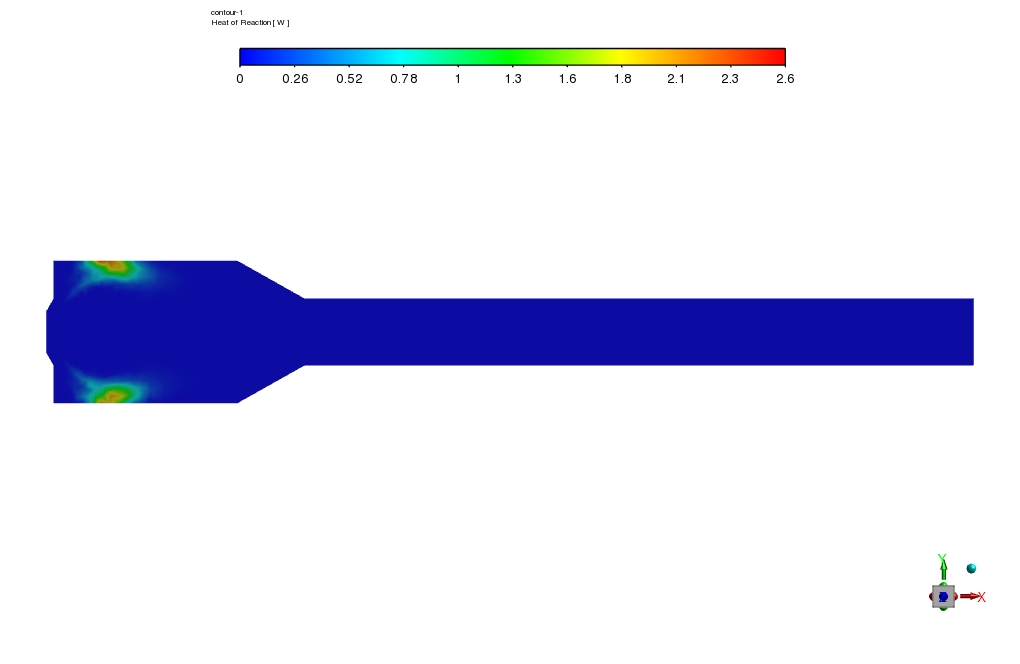 The main combustion process takes place in the combustion chamber itself. This can be explicitly seen in the contour of temperature reaction heat, which shows that the maximum temperature gradient and maximum reaction heat are observed.