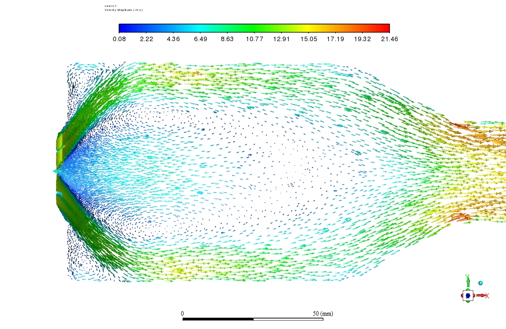 At the end of the solution process, two-dimensional contours related to the temperature, velocity, species mass fraction, streamlines, velocity vectors, etc., inside the combustion chamber are obtained. The mixture mass flow rate at the outlet is equal to 0.004885042 kg/s.