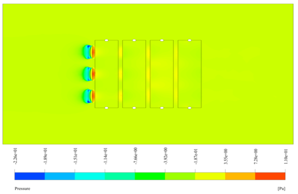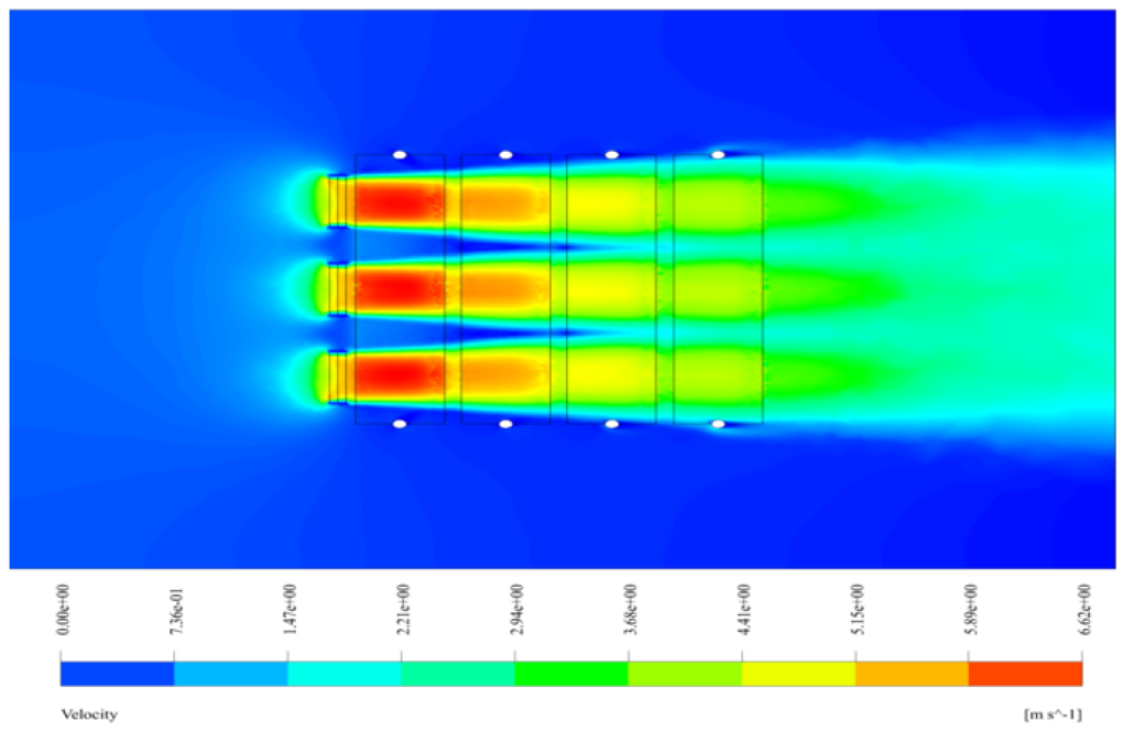 In the simulation, fan properties are defined to maintain accuracy by using the ‘Fan’ boundary condition and incorporating a polynomial pressure function that incorporates coefficients to represent the pressure jump across the fans. The flow direction is reversed to simulate the blowing action and is aligned with the rotational axis of the fans as per the model’s requirements. The combination of these settings helps achieve accurate representation of the fan behavior within the simulated environment.