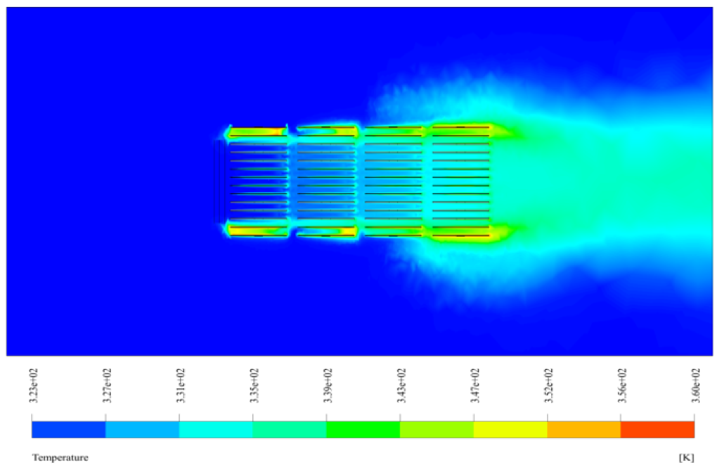 These temperature changes are mainly due to the movement of the flow in the vertical direction. The mentioned UDF is written linearly in the form 346.15 + 5 * y. Also, to apply the effect of the fans, the Fan boundary condition is used in the plates located in the middle of the side of the radiator.
