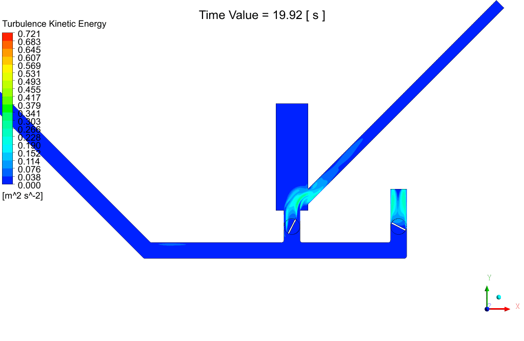 At the end of the simulation, we can see the velocity and pressure meters. It is clear that when both valves are half-closed, this suffocation increases the pressure in the pipe and when one of the valves, The face is entirely open. The other valve is completely closed. All the inlet fluid comes out with the high pressure created by the open side.